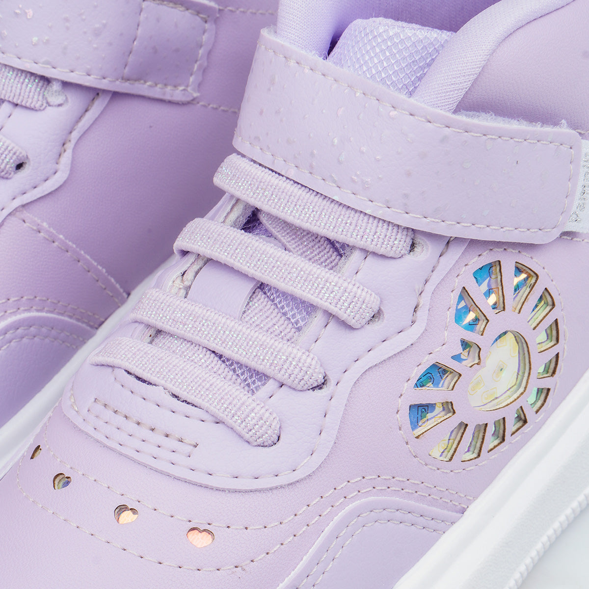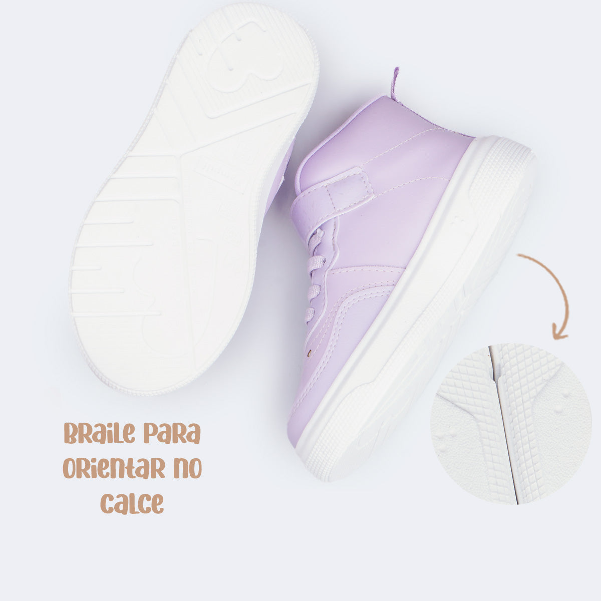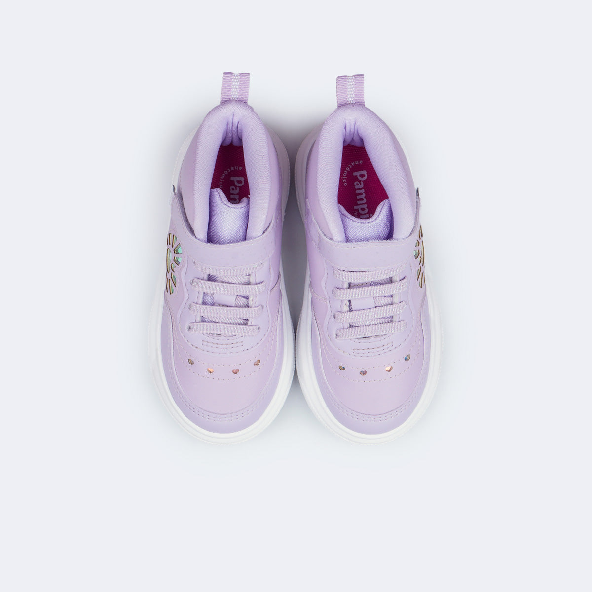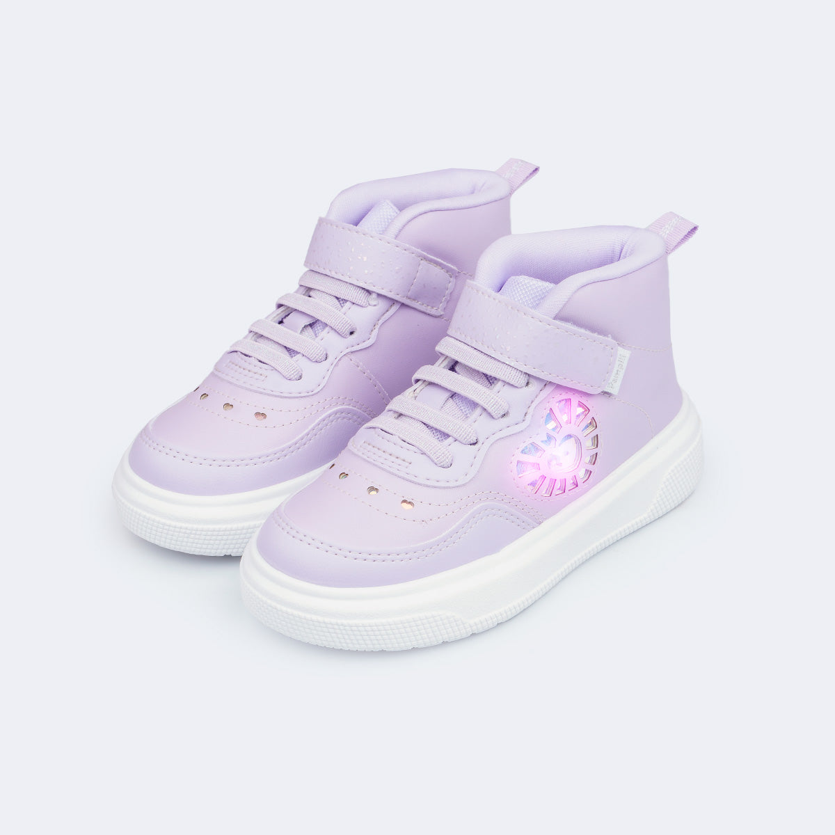O tênis cano médio infantil lilás une atitude, conforto e tecnologia em um modelo que conquista no primeiro olhar. O destaque visual fica por conta do recorte holográfico lateral em formato de coração, com luzes de LED que acendem a cada passo, deixando as produções ainda mais divertidas e cheias de estilo. O fechamento em fita aderente facilita o calce e garante ajuste seguro para o dia a dia das meninas.