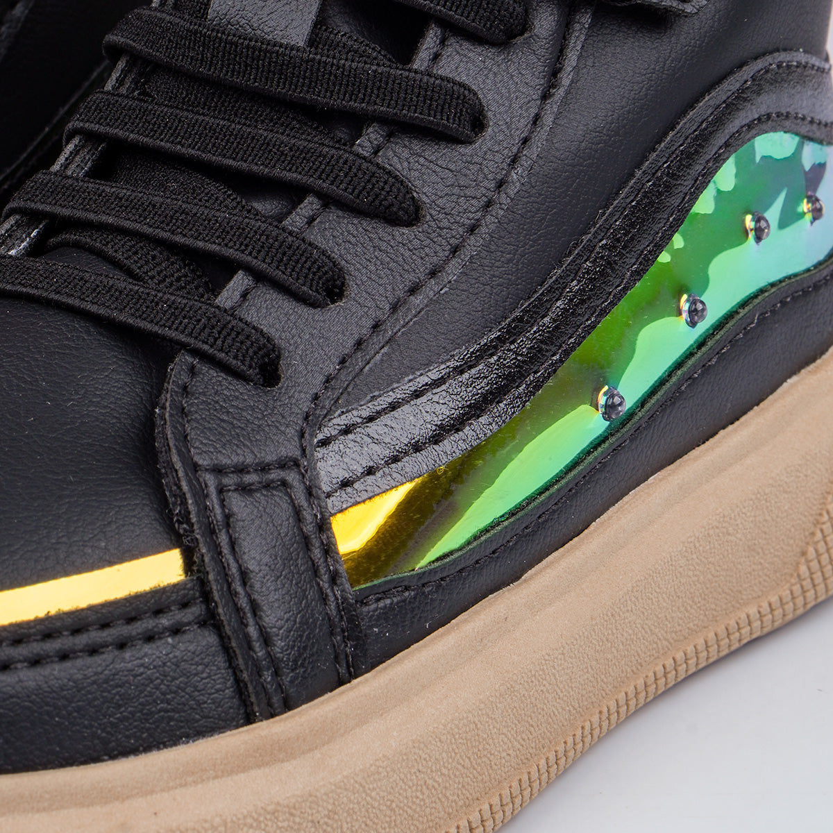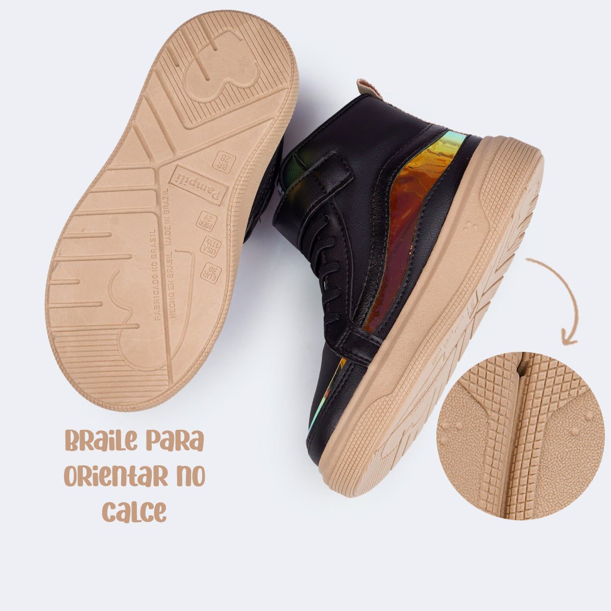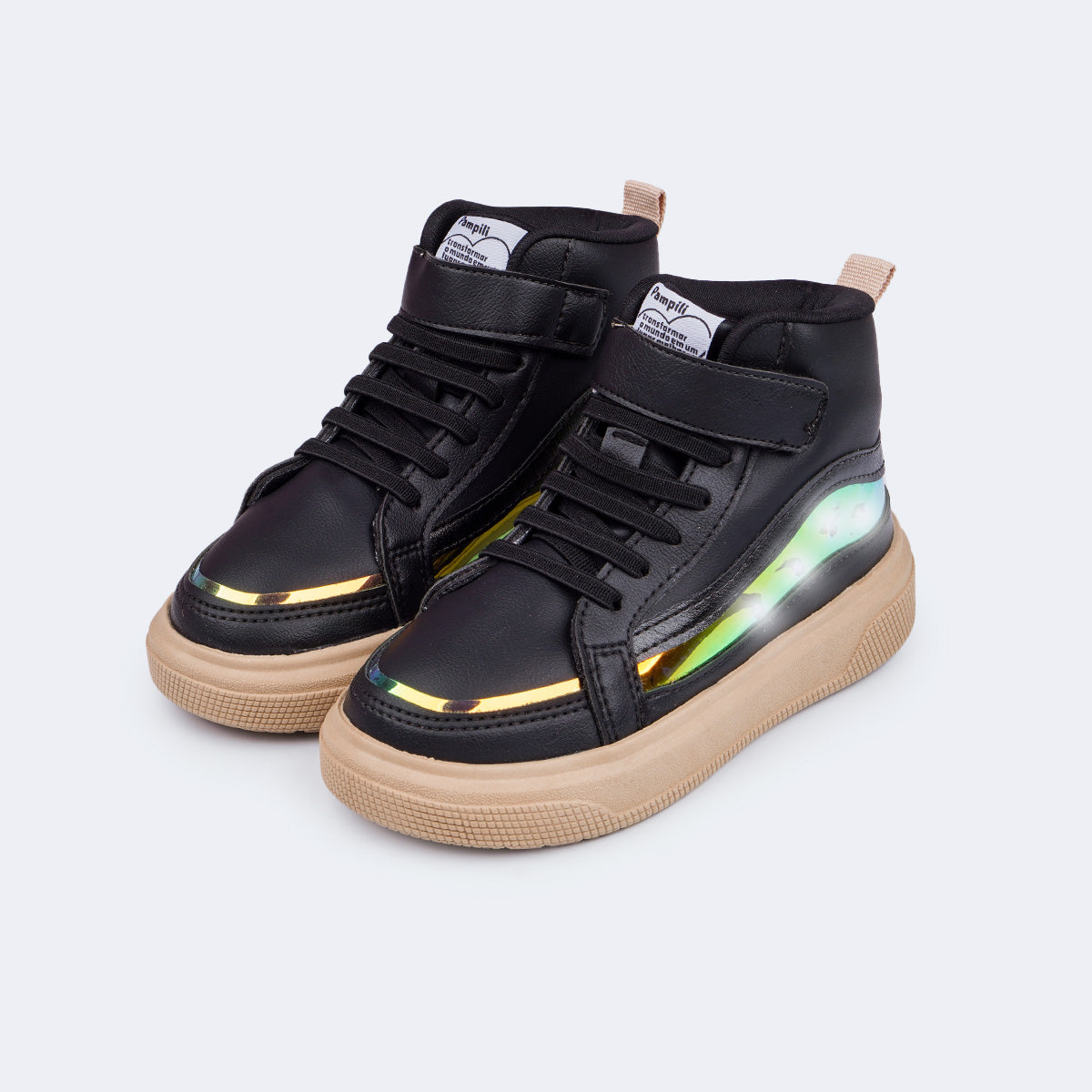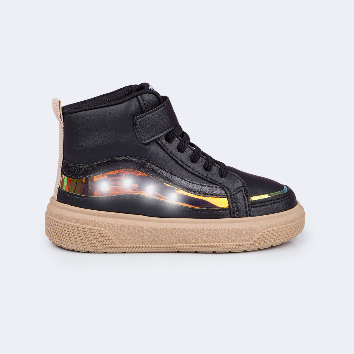 Tênis de led infantil preto com cano médio é a combinação perfeita de estilo e conforto para acompanhar as meninas em todos os momentos. Com recortes holográficos e luzes de LED brancas na lateral, o modelo traz um visual fashion, ideal para passeios e momentos de laser com muito charme.
