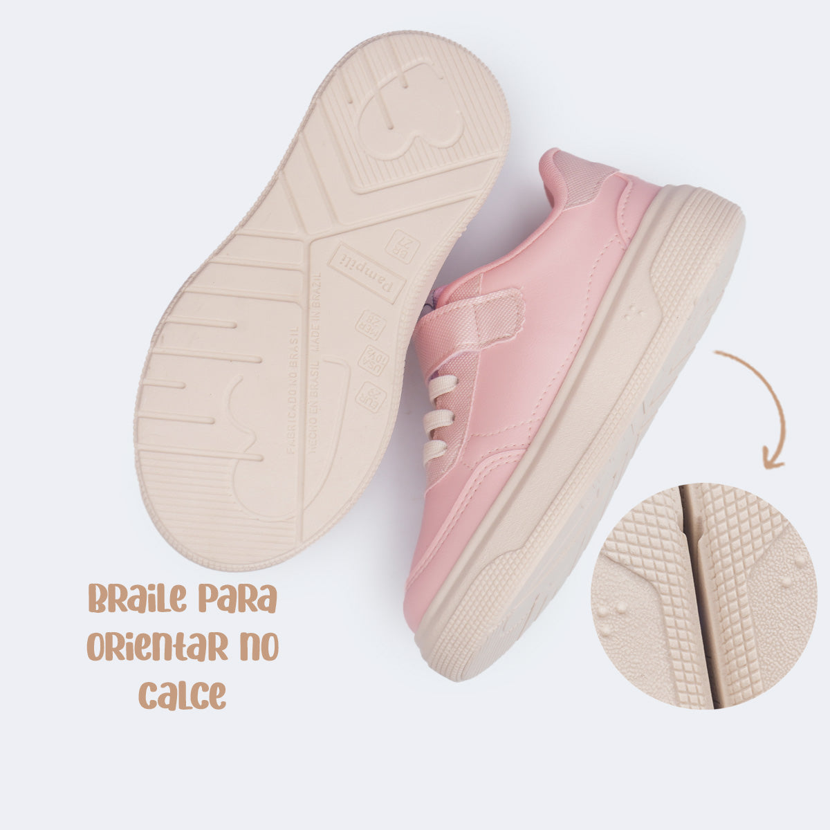 O fecho de contato com elástico garante um calce fácil e rápido, oferecendo mais autonomia para as meninas. O solado é resistente e antiderrapante, ideal para o dia a dia. Além disso, conta com inscrição em braile no solado, ajudando na identificação do pé direito e esquerdo para meninas cegas ou com baixa visão.