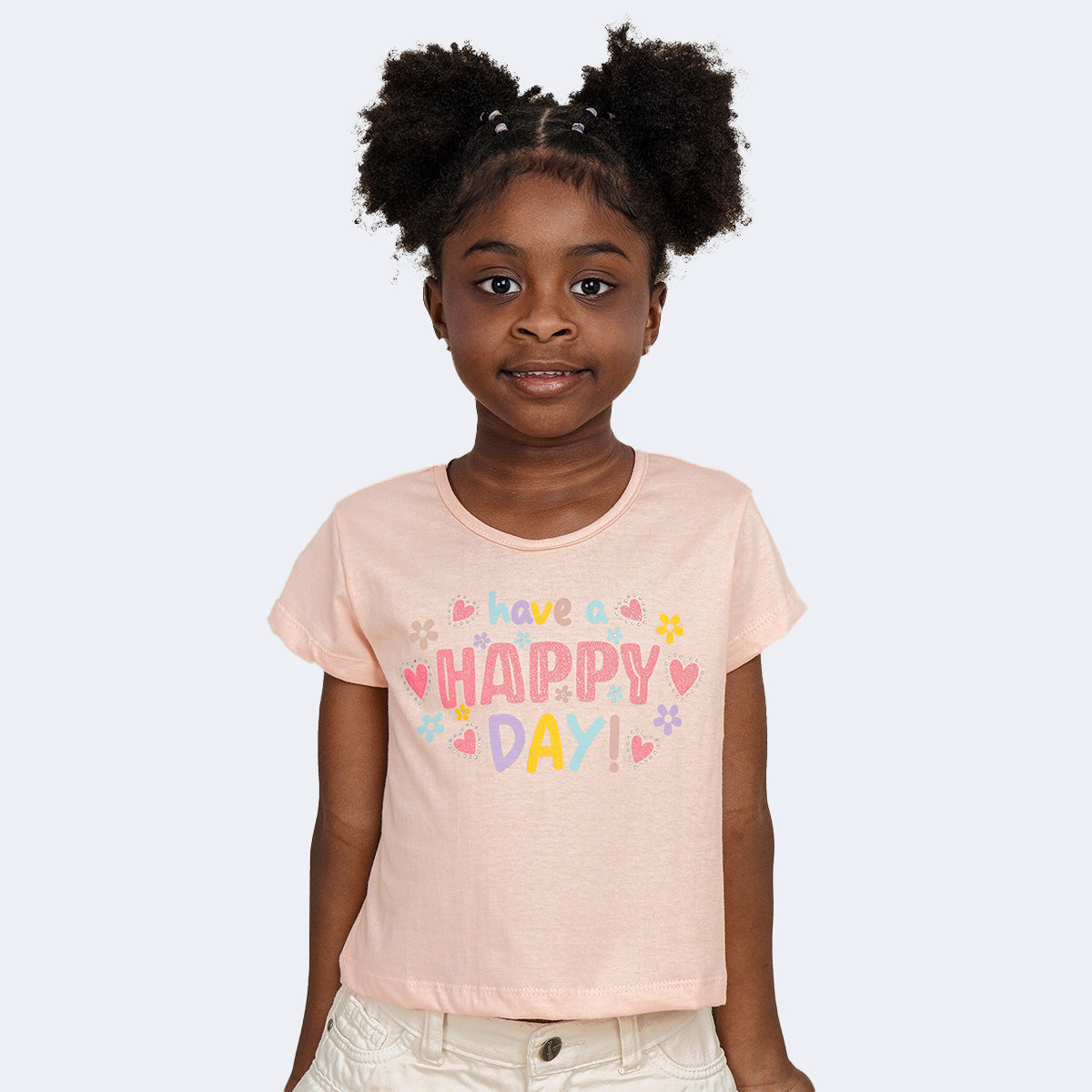 Uma camiseta que transmite alegria em cada detalhe! O modelo pêssego tem estampa colorida com a frase "Have a Happy Day", decorada com corações, flores e brilhinhos delicados que dão um toque especial. Feita em 100% algodão, é macia e confortável, perfeita para acompanhar as meninas em momentos de diversão no dia a dia.