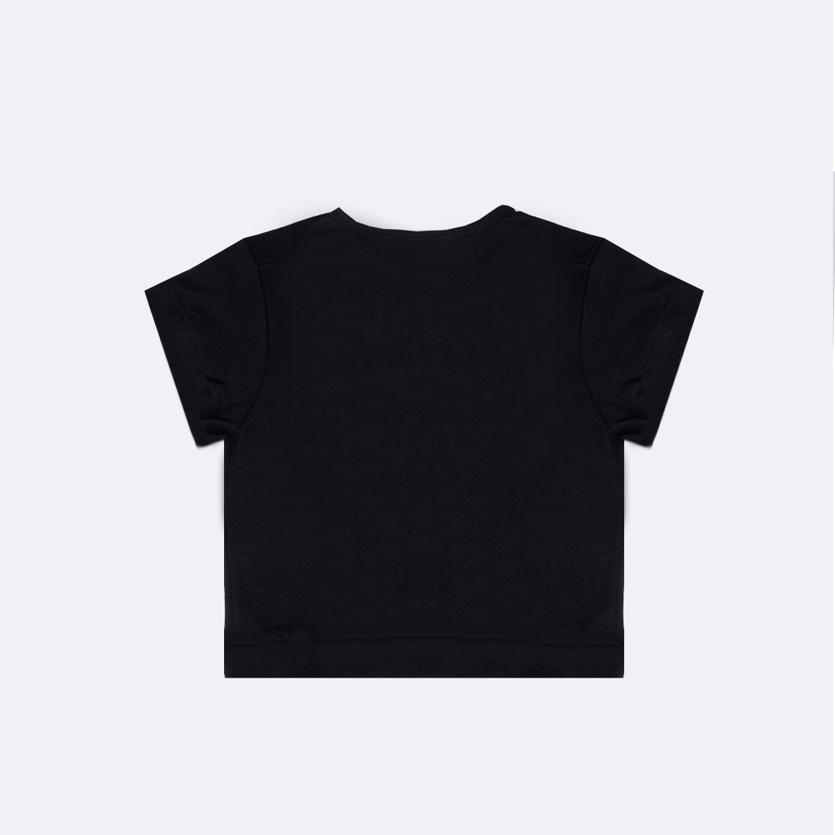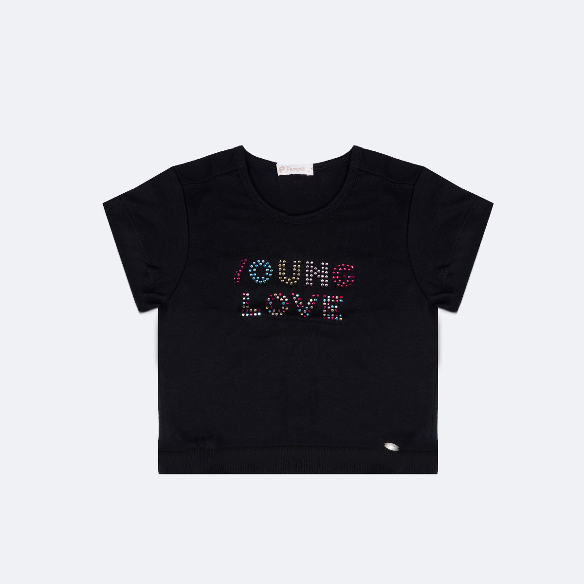 Camiseta infantil feminina preta, com aplicação de strass coloridos em hotfix na parte frontal formando a frase "Young love", um modelo moderno para o dia a dia e festas! Camiseta feminina super macia e flexível, confortável para acompanhar a menina nas brincadeiras. A camiseta possuí mangas curtas e peça de metal dourado Pampili na barra.