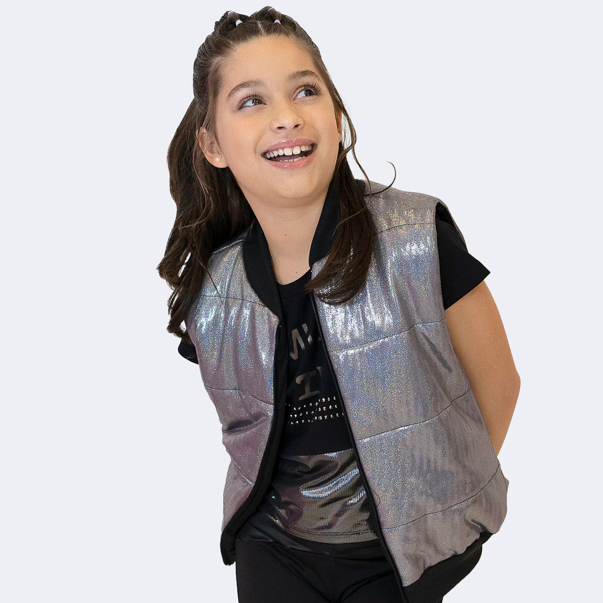 Colete infantil feminino em poliéster acolchoado prata holográfico, super fofinho e aconchegante para a menina arrasar no inverno. O colete puffer tem costuras em gominhos, um modelo super estiloso! Colete com fechamento em zíper na parte frontal. Gola e barra em ribana preta. Peça em metal dourado Pampili na barra.
