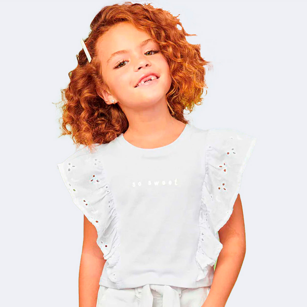 Conjunto infantil feminino de camiseta branca em algodão com cotton e babado de laise, moderno e romântico como as meninas amam! Camiseta cavada de gola redonda e estampa frontal prata "So sweet" "Tão Doce". Short infantil em sarja de algodão, com laço dianteiro. Short branco em elástico e detalhe de etiqueta em metal da marca.