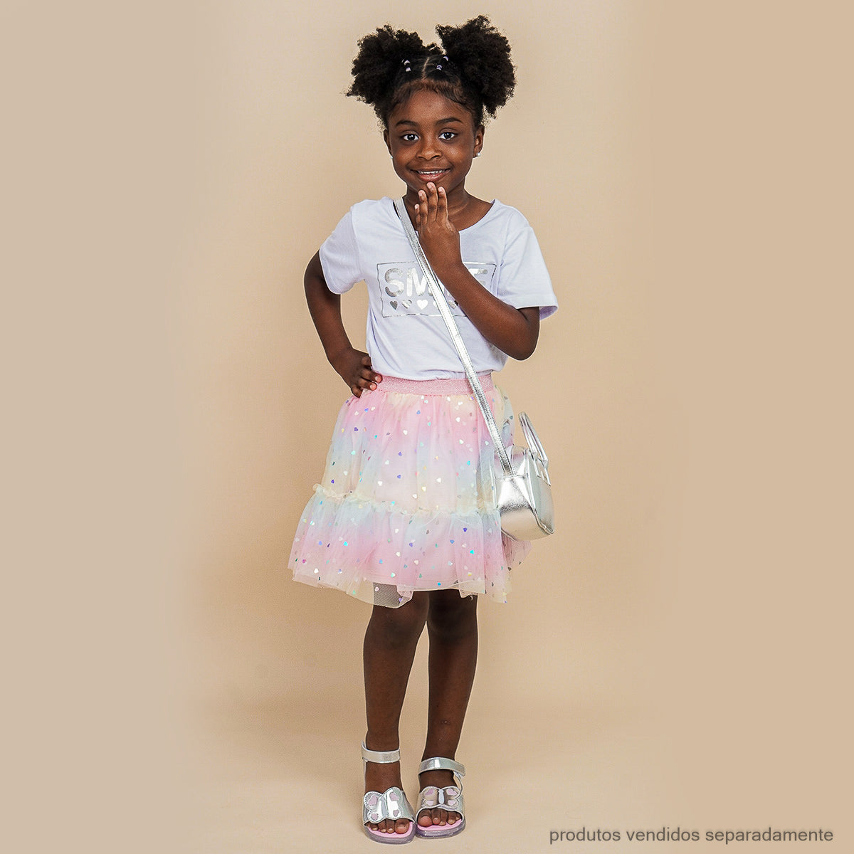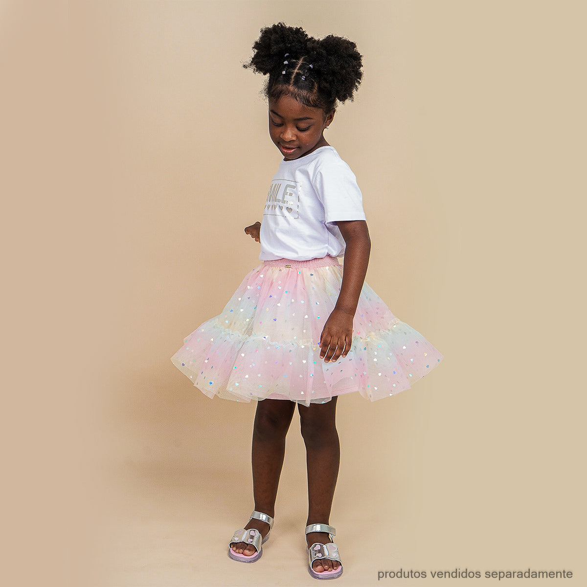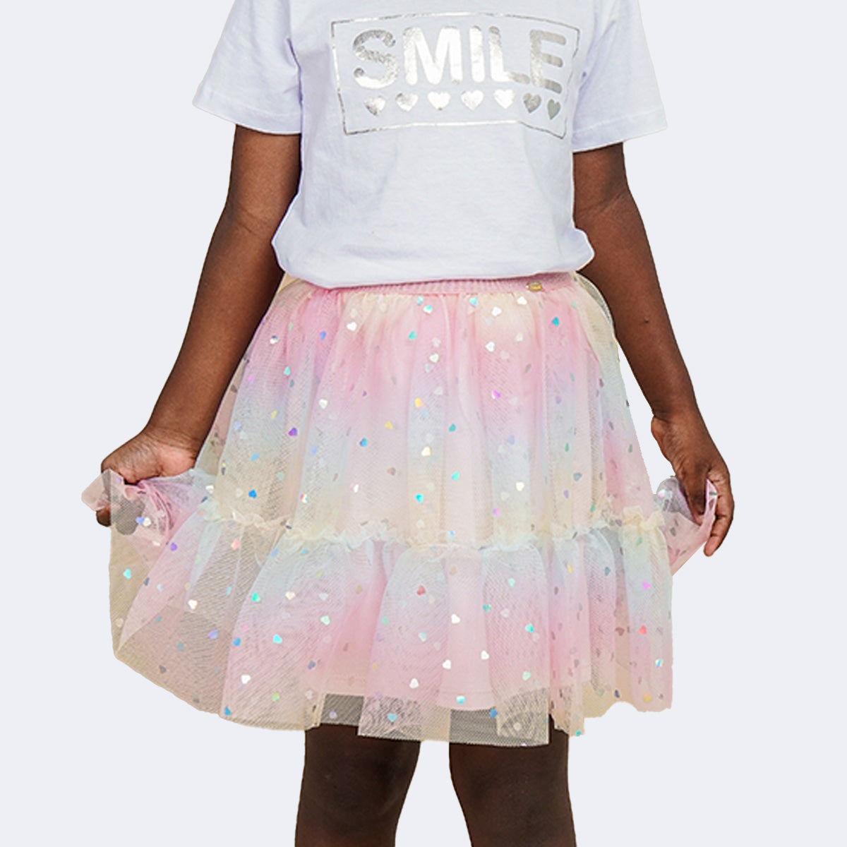 Delicada e alegre, esta saia rosa de tule é perfeita para meninas que gostam de brilhar. O efeito tie dye e babadinhos esvoaçantes com corações holográficos criam um visual divertido e arrumadinho, ideal para ocasiões especiais. O cós com ajuste confortável garante liberdade de movimentos, enquanto o forro em algodão proporciona maciez e bem-estar. Uma peça versátil para transformar produções especiais e momentos inesquecíveis.