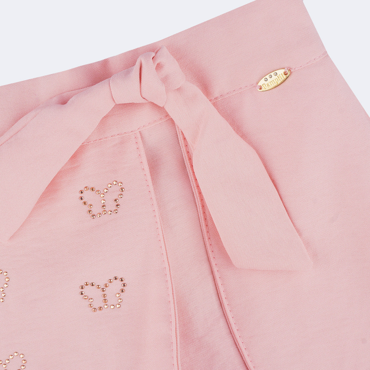 O detalhe transpassado na frente com amarração lateral, traz movimento e charme extra ao visual. As aplicações de mini strass rosê formando borboletas deixam a peça ainda mais especial, com um toque sutil de brilho que encanta as meninas.