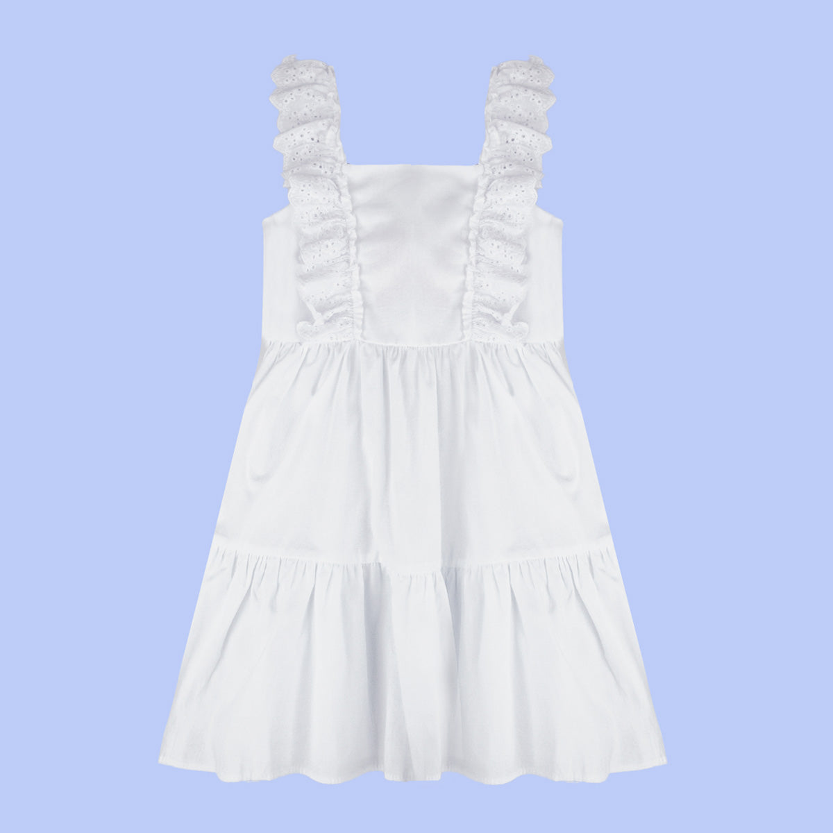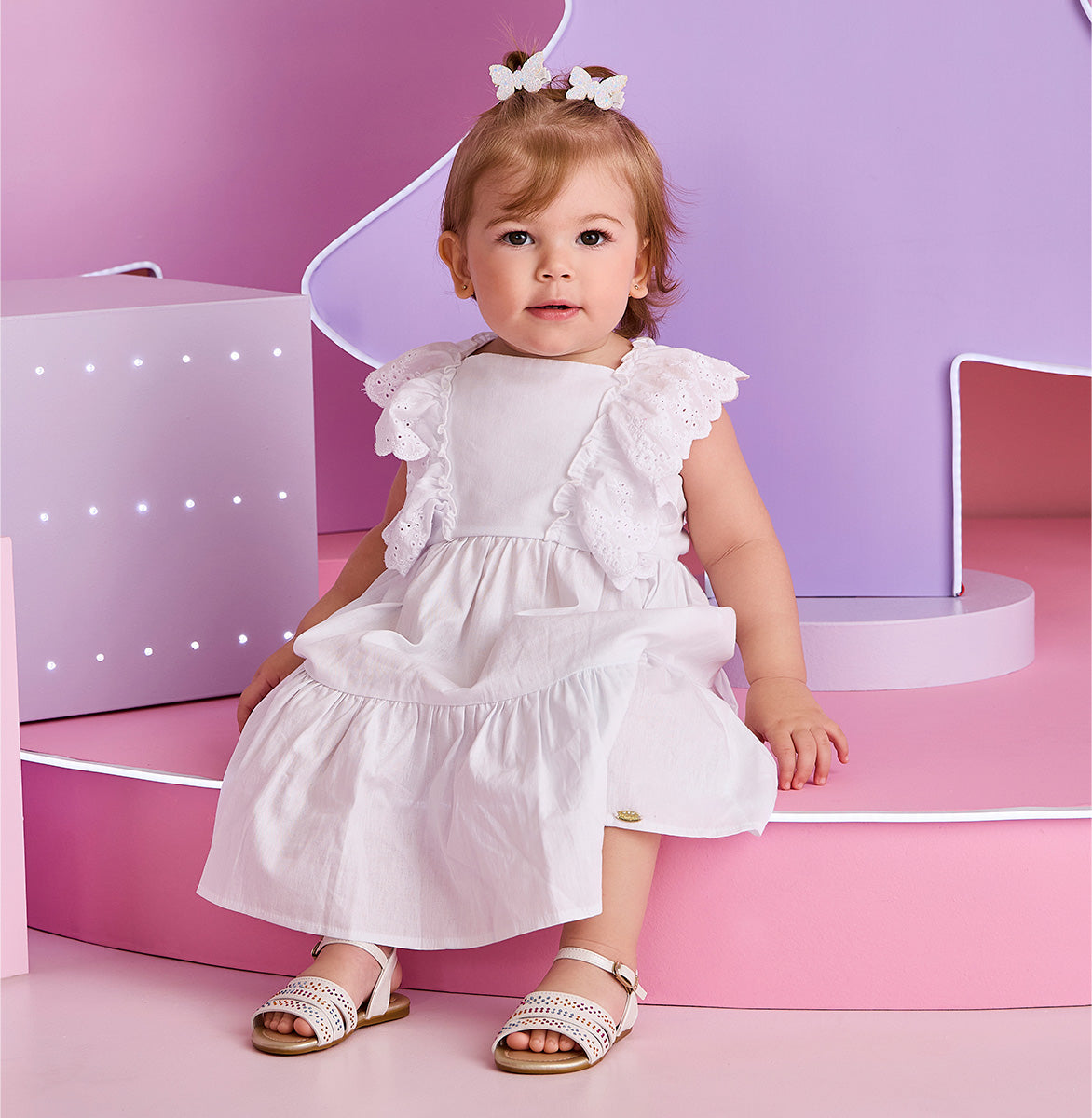 Delicado e cheio de movimento, este vestido branco infantil traz uma modelagem soltinha que deixa a menina confortável em todos os momentos. Confeccionado em algodão, o tecido leve acompanha os dias quentes com muito charme, enquanto as alças com babadinhos em laise acrescentam um toque romântico ao visual.