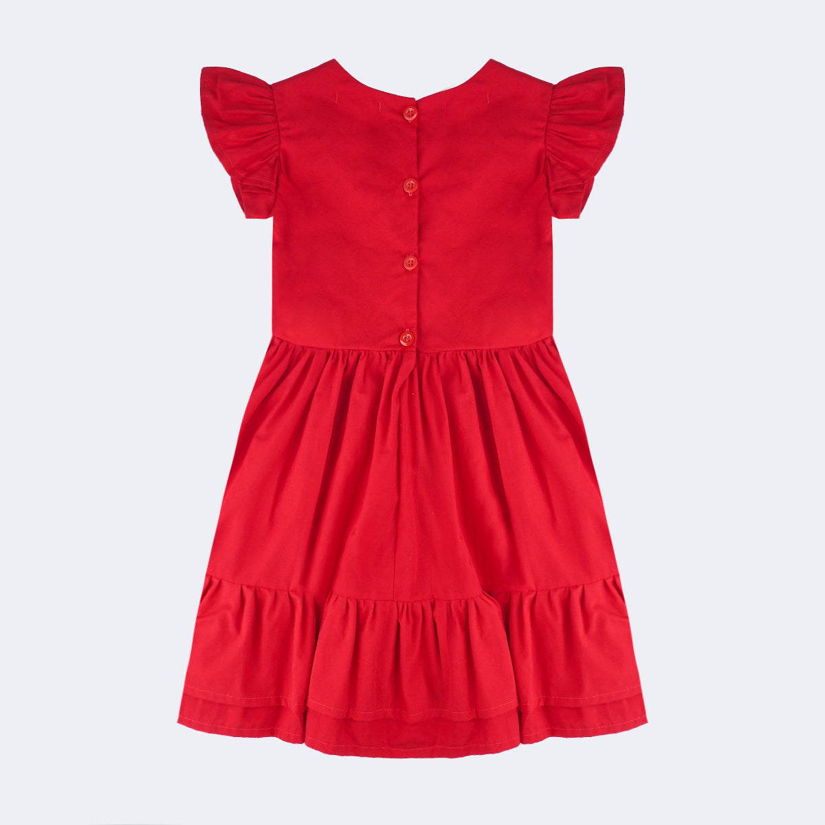 Vestido infantil vermelho em algodão macio, que proporciona conforto, leveza e um toque suave na pele das meninas. O design com mangas franzidas e saia em camadas cria um movimento delicado e encantador, enquanto as aplicações de hotfix vermelhos na gola adicionam um brilho sutil que eleva o visual. O fechamento por botões nas costas completa o modelo com um toque tradicional e elegante, perfeito para celebrar datas especiais com muito estilo.