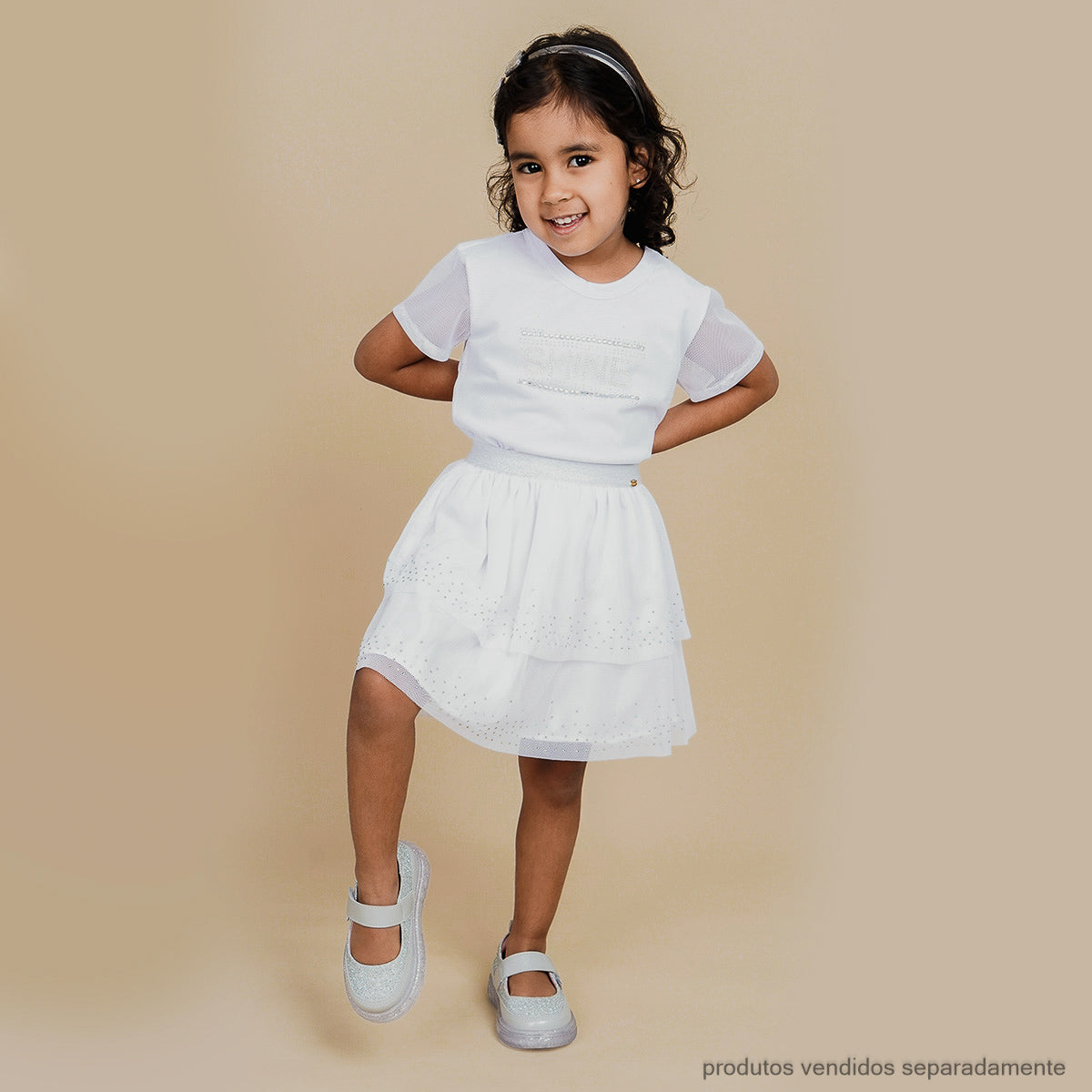 Camiseta infantil feminina em algodão e tela sobreposta branca, moderna para as meninas arrasarem no dia a dia! Frente com aplicação hotfix de strass com a escrita "Shine" "Brilhar". Camiseta de gola redonda e mangas curtas. A camiseta tem etiqueta da marca em metal dourado com strass na barra frontal.