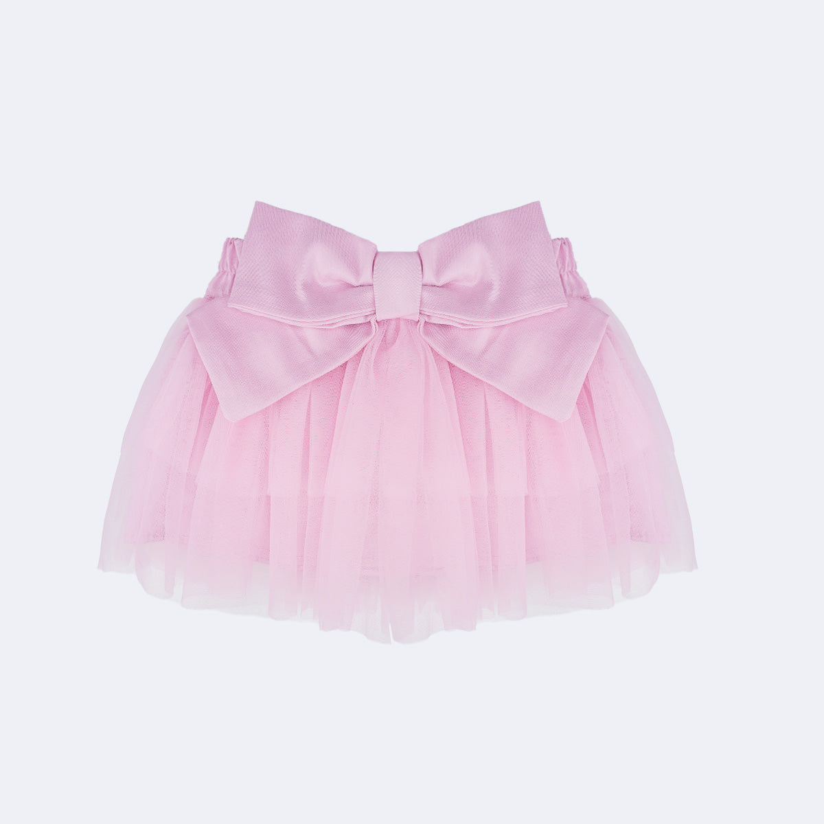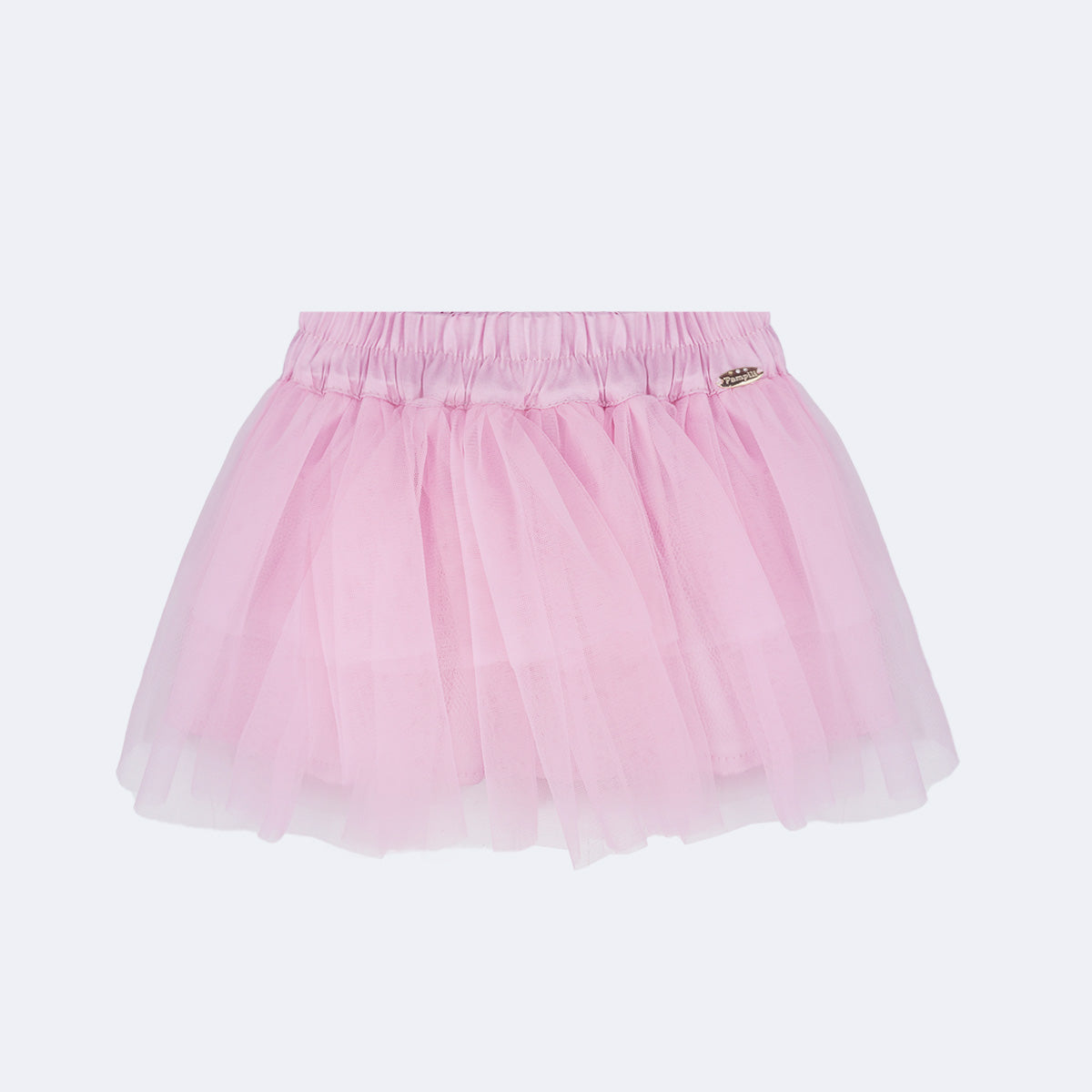 Saia de tule infantil rosa com laço na parte traseira, uma fofura! Saia com forro em poliéster, dando mais conforto e segurança para as bebês. Saia de elástico na cintura e etiqueta em metal dourado no cós, super sofisticada para a menina arrasar!