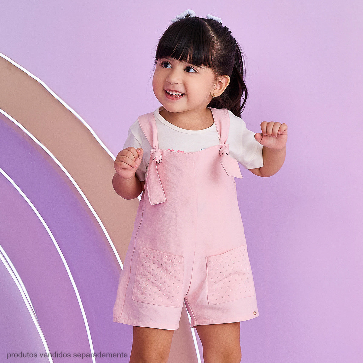 Esse macacão curto rosa é a escolha perfeita para as meninas que amam conforto com um toque delicado de estilo. O modelo possui alças largas com amarração, permitindo ajuste ao corpo, além de bolsos frontais com aplicação de strass com brilho discreto e deixam o visual ainda mais encantador.