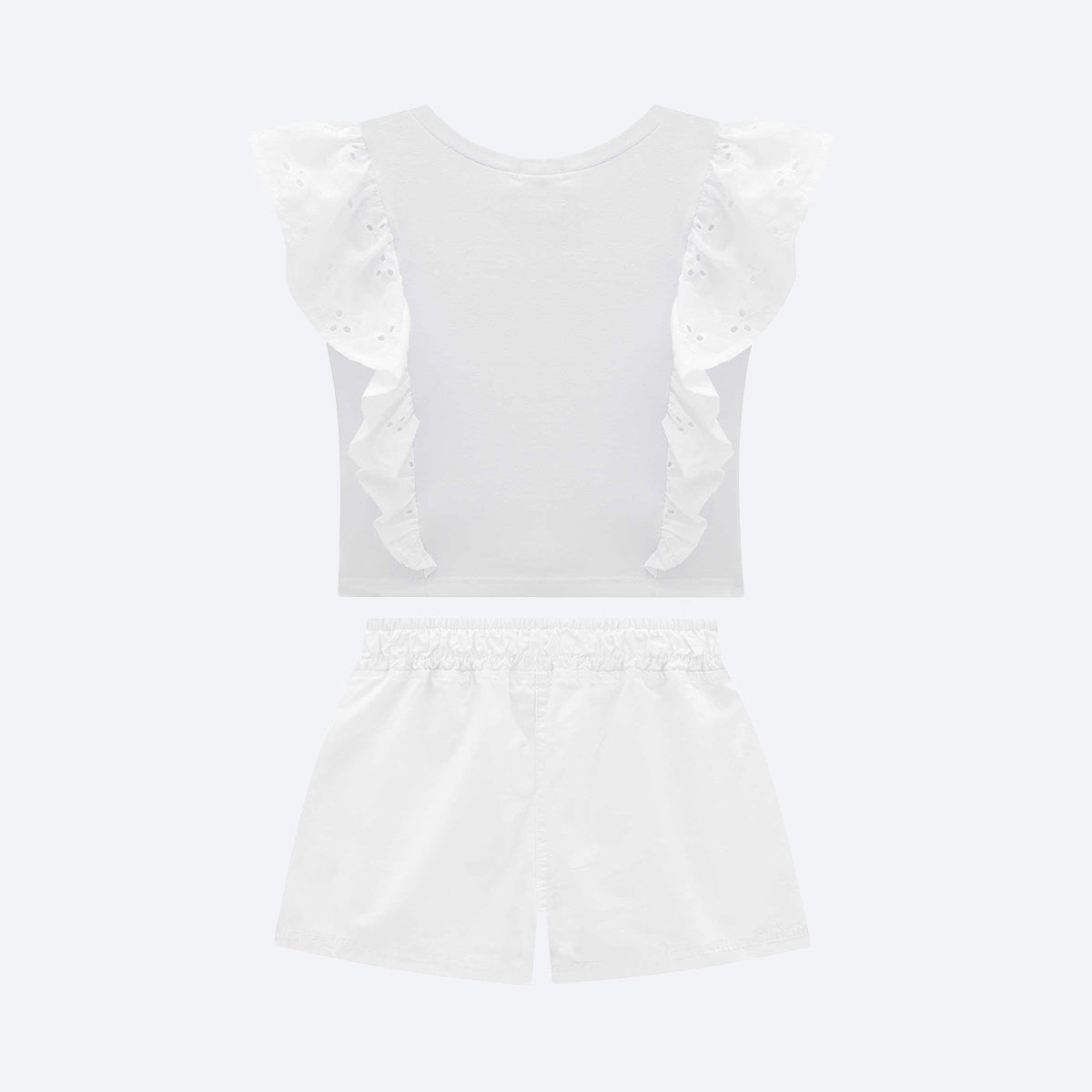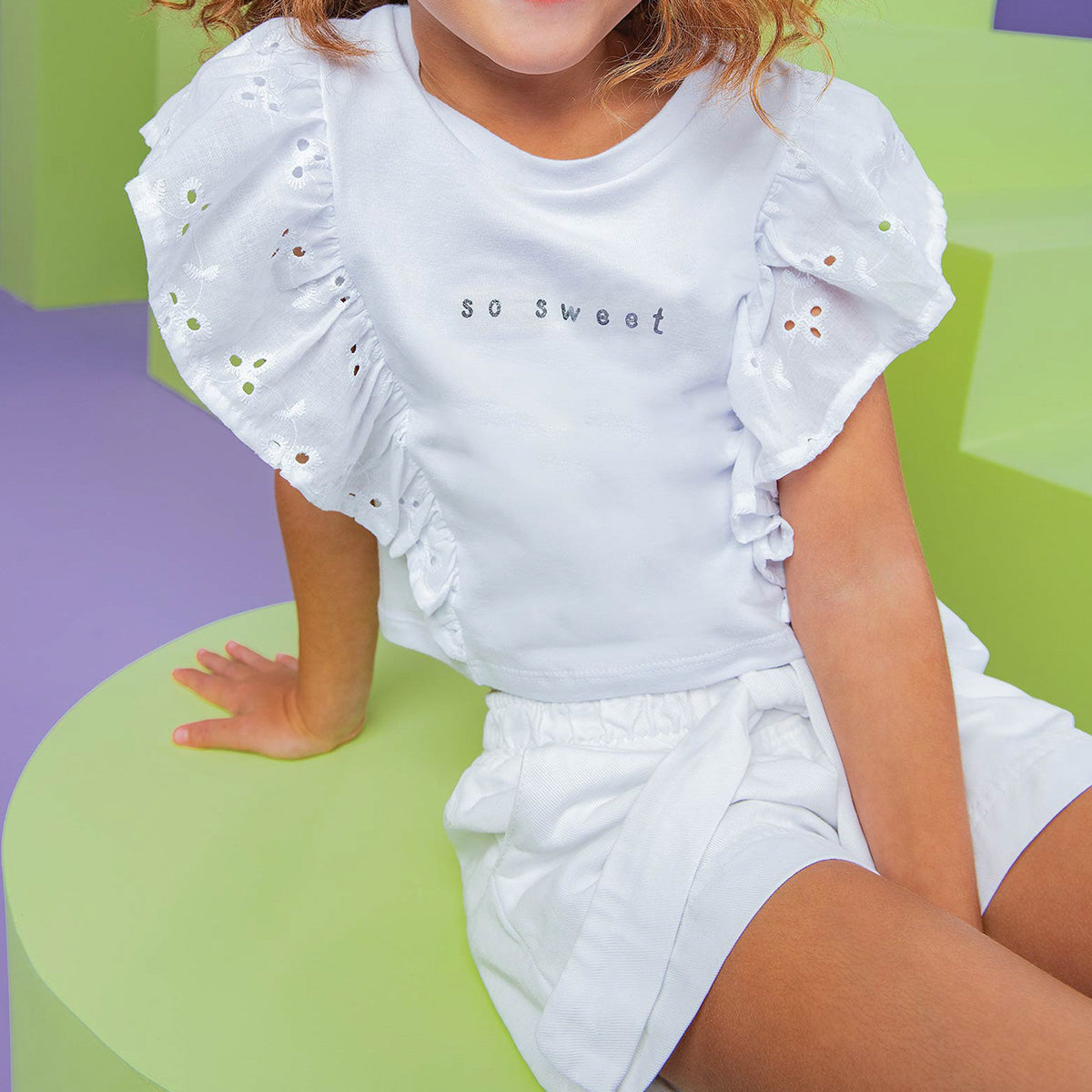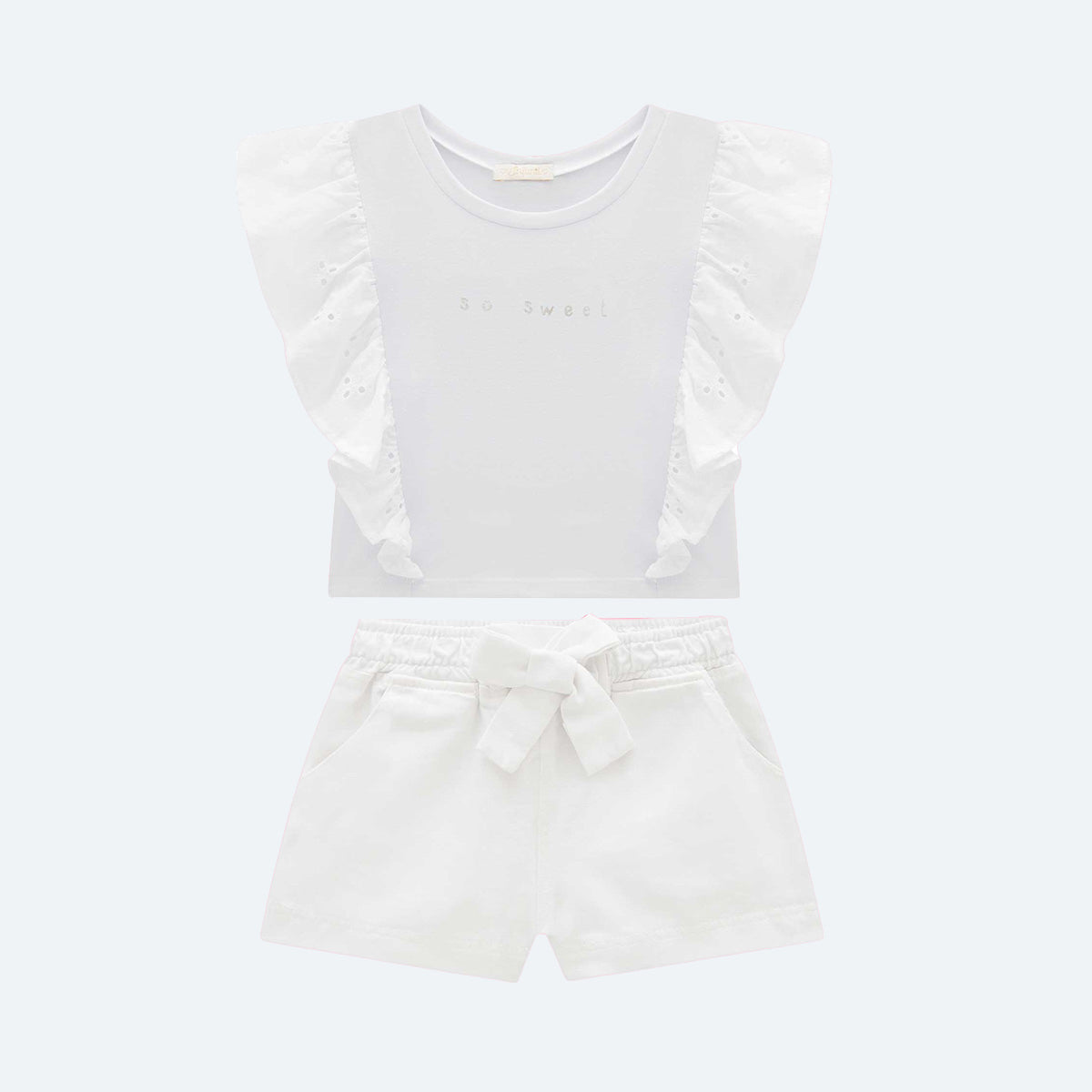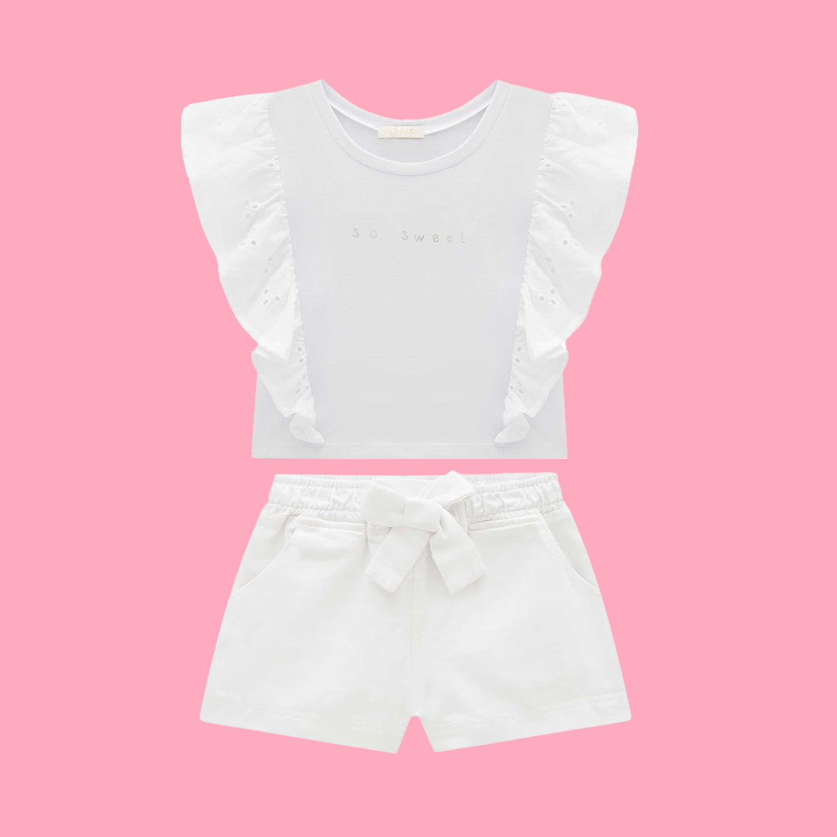 Conjunto infantil feminino de camiseta branca em algodão com cotton e babado de laise, moderno e romântico como as meninas amam! Camiseta cavada de gola redonda e estampa frontal prata "So sweet" "Tão Doce". Short infantil em sarja de algodão, com laço dianteiro. Short branco em elástico e detalhe de etiqueta em metal da marca.