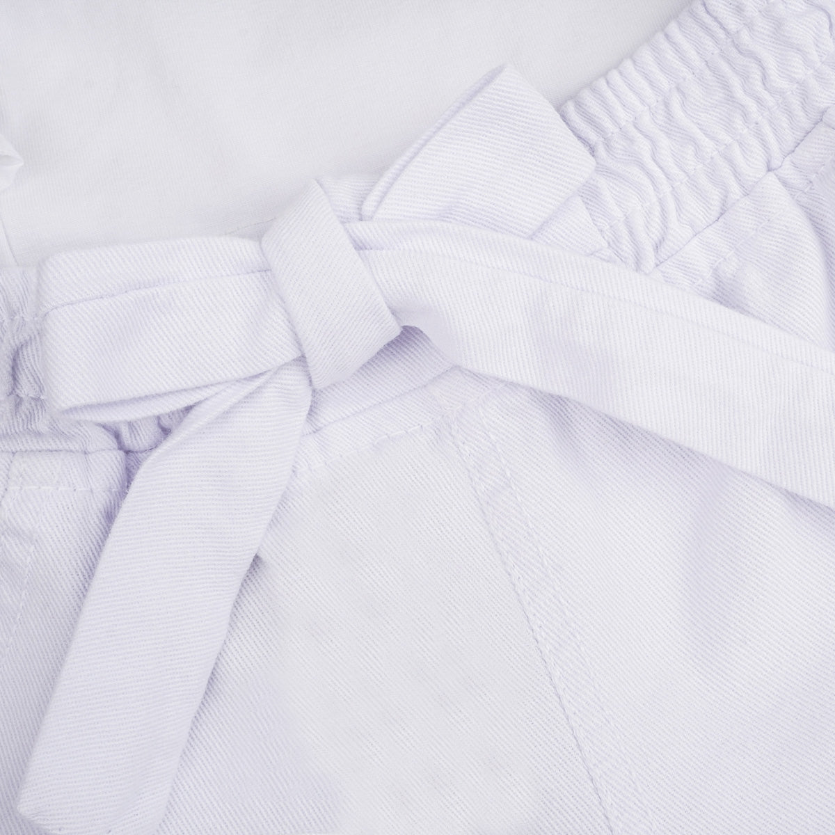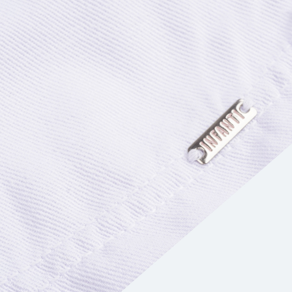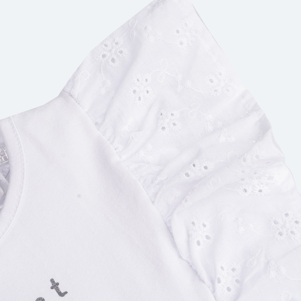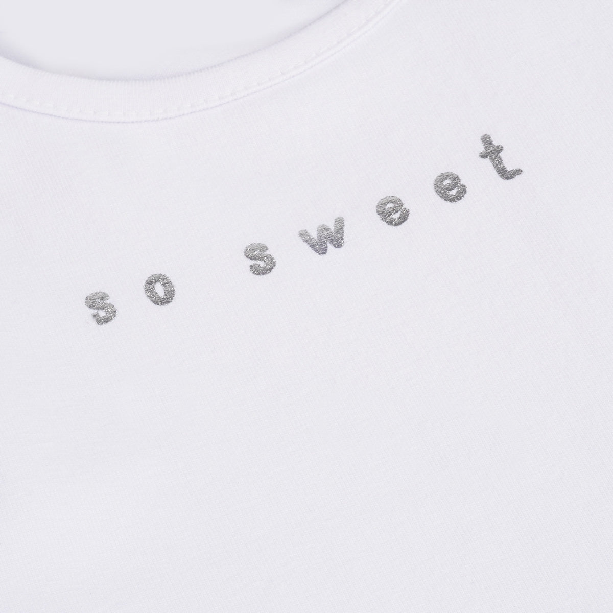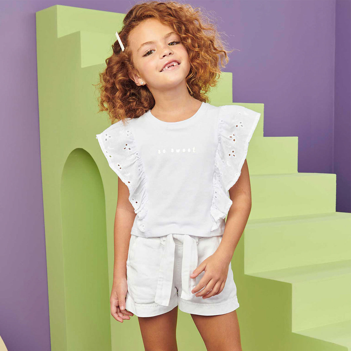 Conjunto infantil feminino de camiseta branca em algodão com cotton e babado de laise, moderno e romântico como as meninas amam! Camiseta cavada de gola redonda e estampa frontal prata "So sweet" "Tão Doce". Short infantil em sarja de algodão, com laço dianteiro. Short branco em elástico e detalhe de etiqueta em metal da marca.