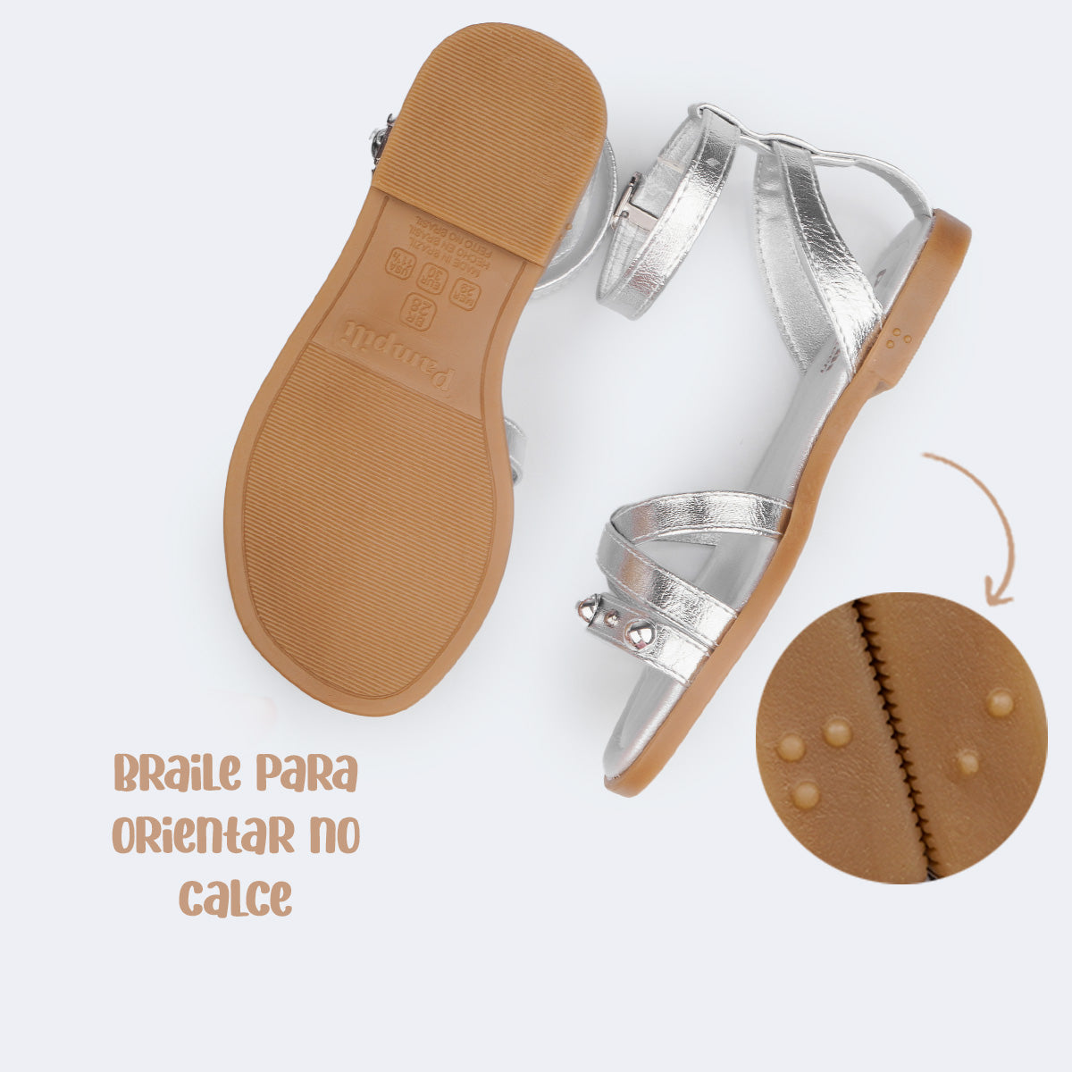 O solado antiderrapante também conta com identificação em braile, ajudando na autonomia de meninas com deficiência visual.
