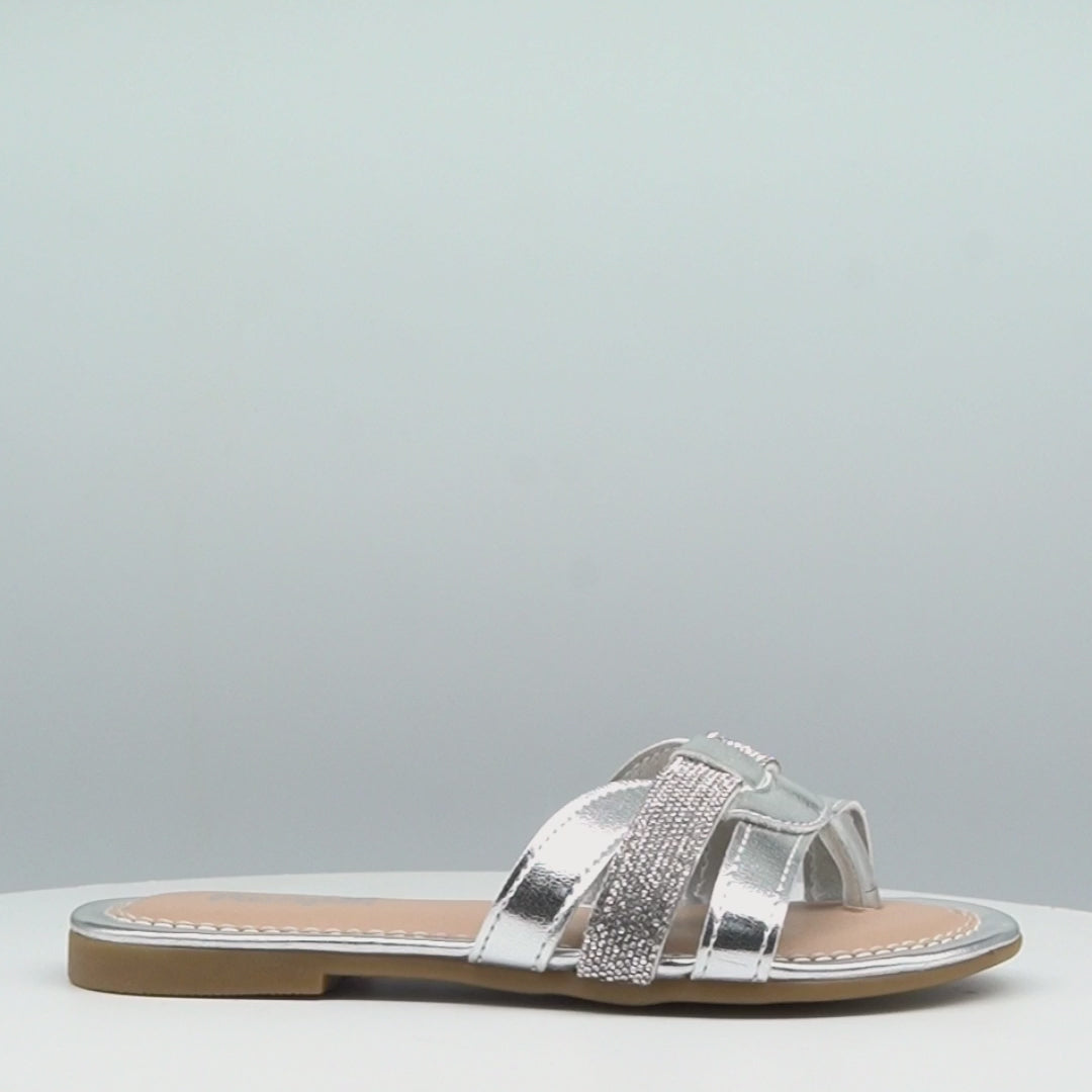 Sandália rasteira prateada com tiras cruzadas e aplicação de hotfix. Rasteirinha infantil metalizada para menina, prática e confortável para o dia a dia.