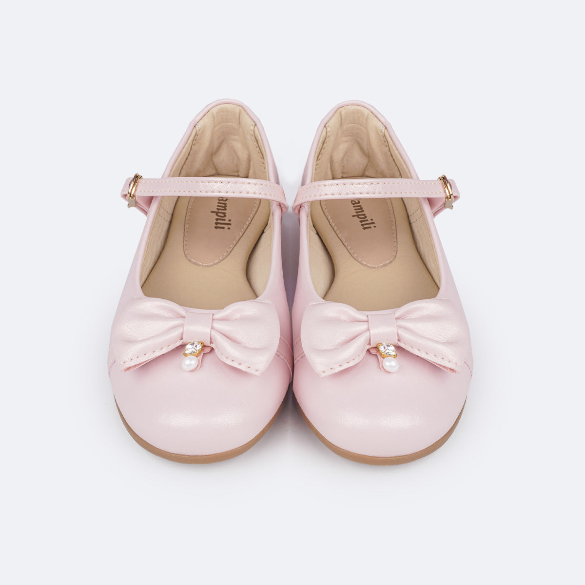 Sapato infantil feminino em sintético rosa com laço frontal e pingente de pérola e strass, dando brilho e romantismo ao look! Sapato infantil com espuma no calcanhar para maior conforto. A sapatilha Pampili possui palmilha e forro em couro, material com a qualidade, durabilidade e conforto que os pezinhos merecem. Sapatilha feminina com solado emborrachado antiderrapante, leve e flexível. Sapato infantil com fechamento em fivela sem pino, que facilita o calce para a mamãe!
