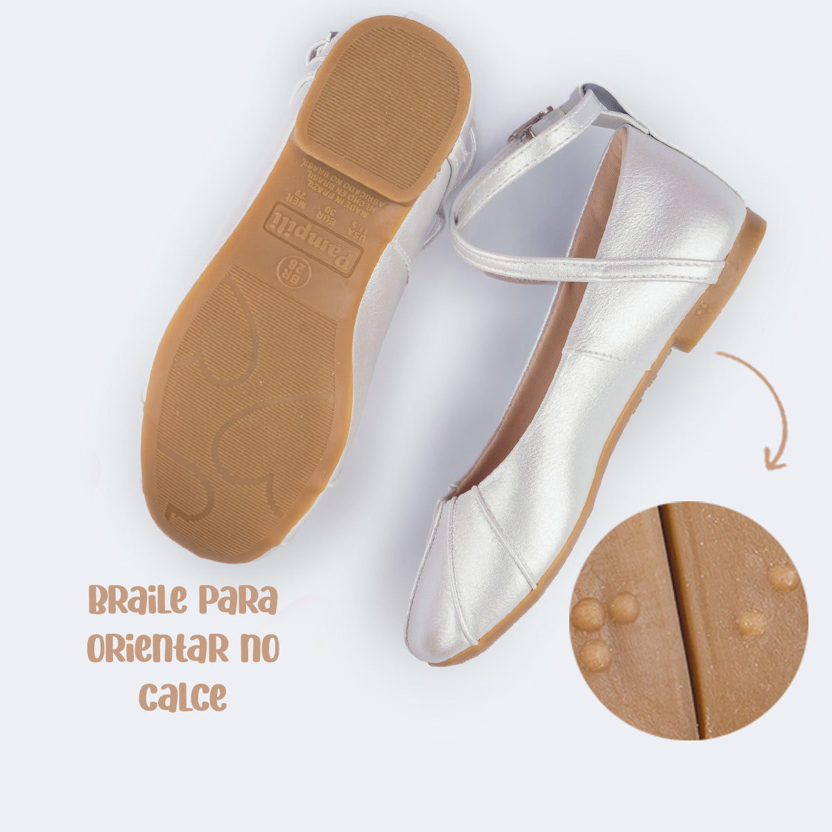 A palmilha anatômica macia, o forro com espuma absorvente e o solado fino em TR eco antiderrapante proporcionam conforto durante todo o uso e segurança em cada passo. O braile no solado demonstra o cuidado com a inclusão e os detalhes que fazem diferença.