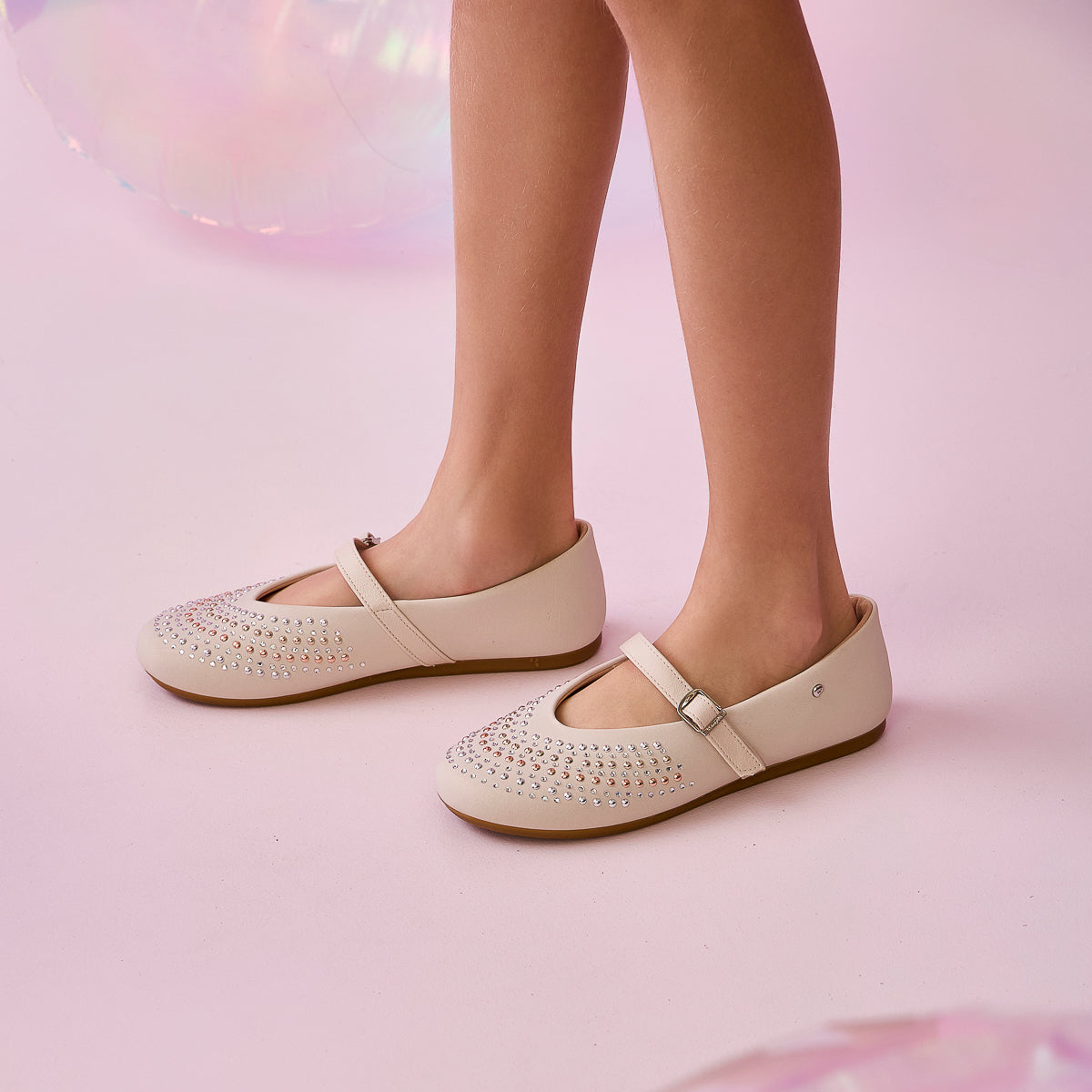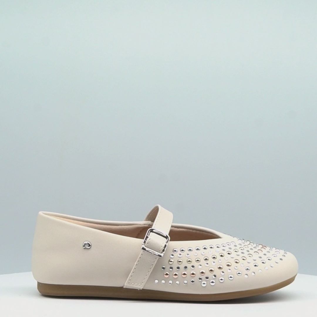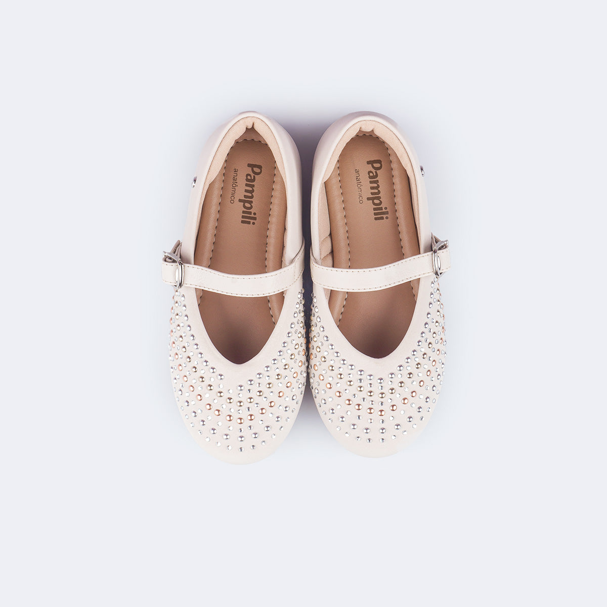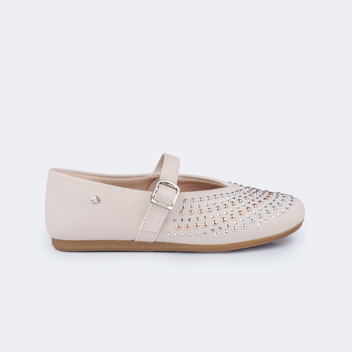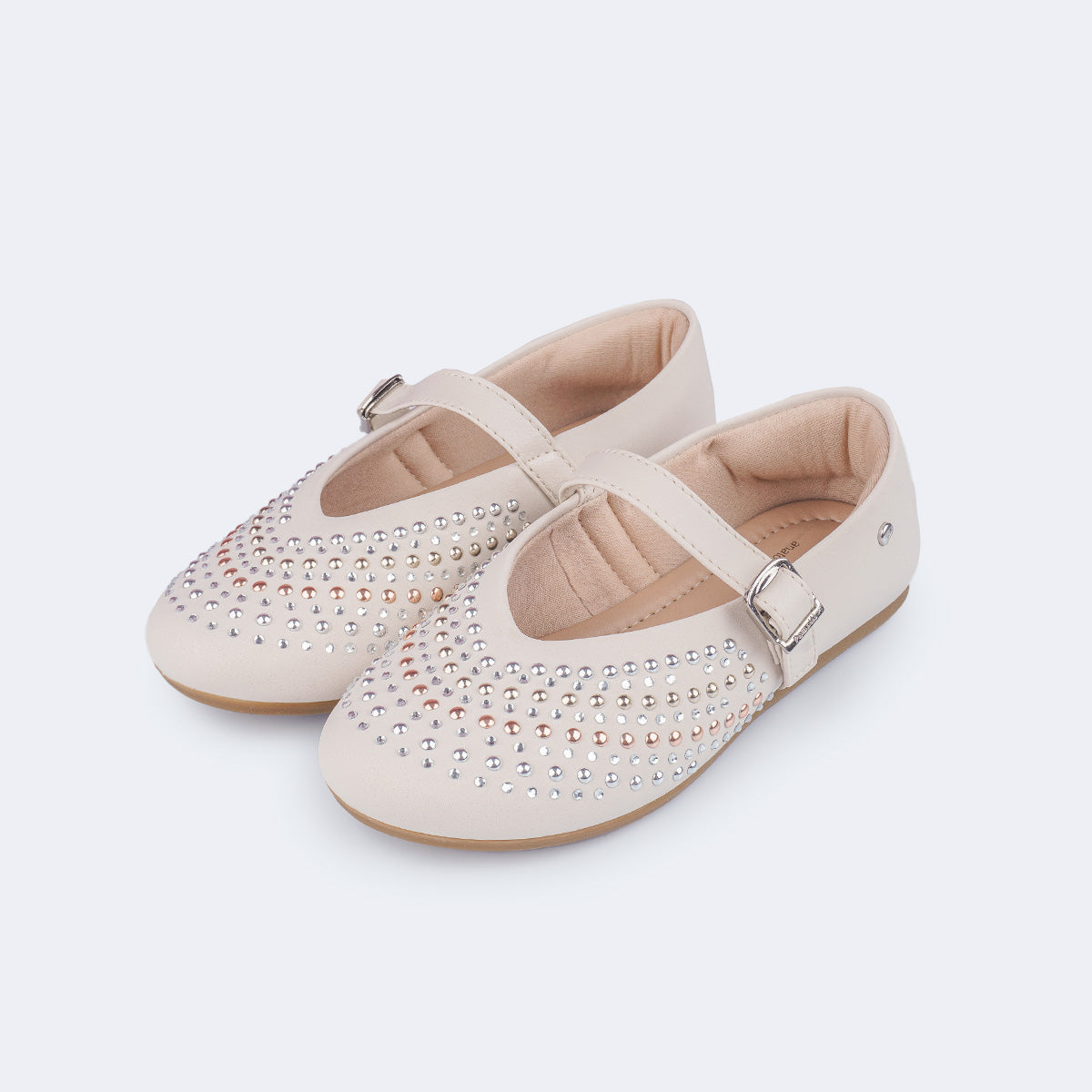 A sapatilha infantil nude Vanila, perfeita para quem ama conforto e estilo em um só modelo. Seu design clássico ganha toque moderno com aplicações de strass e tachas metalizadas no cabedal, que refletem a luz de forma sutil e elegante.
