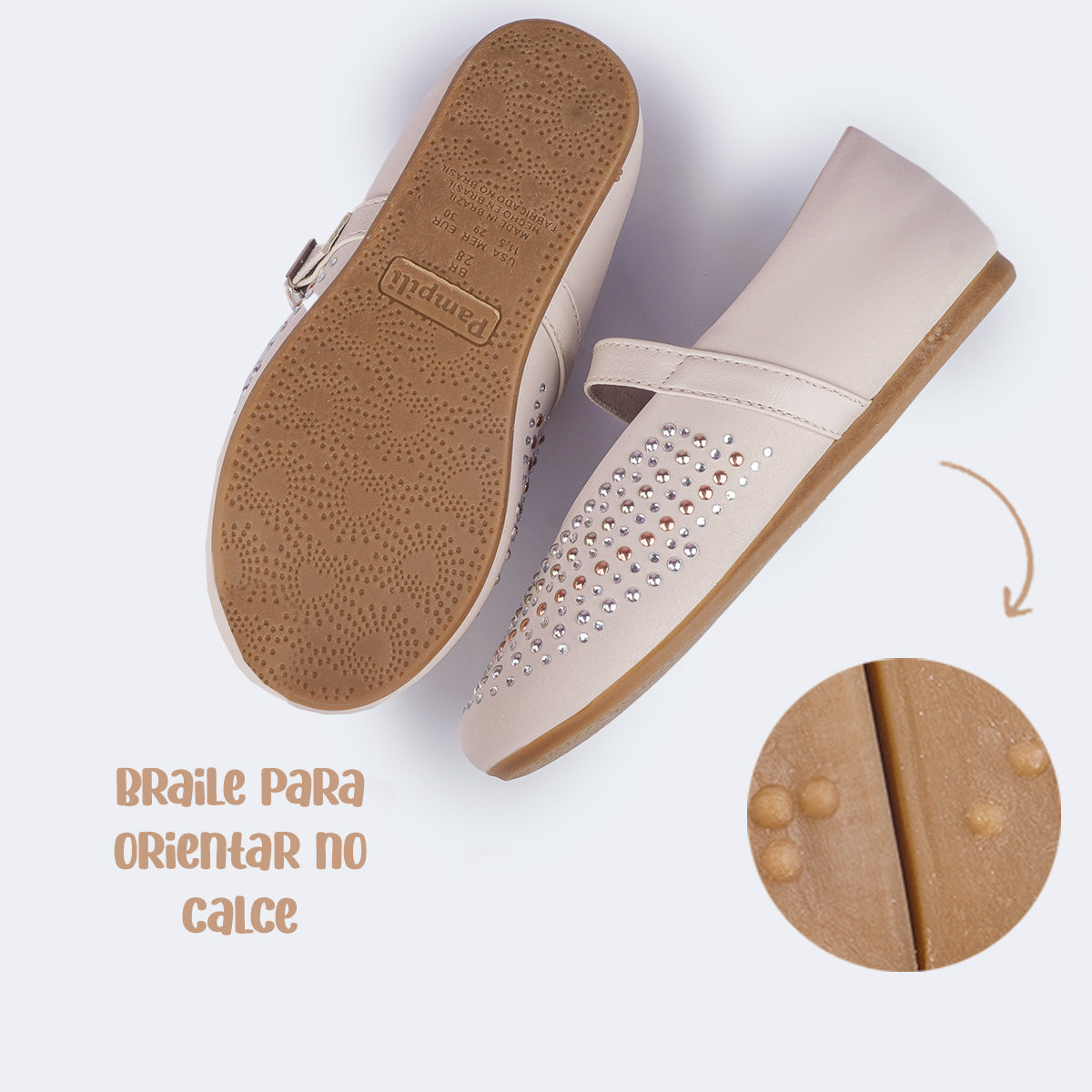O fechamento por fivela easy garante praticidade e ajuste personalizado aos pés, enquanto a palmilha anatômica e o forro com espuma macia absorvente proporcionam conforto durante todo o uso. O solado em TR eco antiderrapante assegura firmeza e estabilidade a cada passo, e a escrita em braile no solado reforça o compromisso com a inclusão e o cuidado nos detalhes.