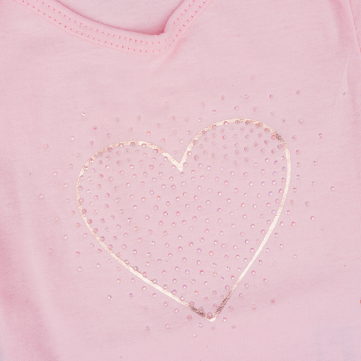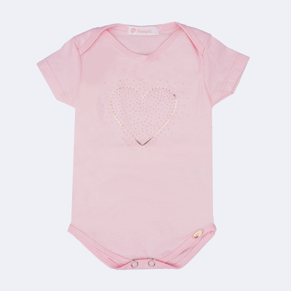 Body infantil em algodão rosa com estampa de coração e aplicação de strass em hotfix na parte frontal, perfeito para presentear a bebê e a mamãe desde a gestação! Body feminino super macio e flexível, confortável para acompanhar a bebê desde os primeiros dias de vida. O body possuí manga curta e fecho em botões de pressão na parte inferior para maior praticidade no dia a dia da mamãe.