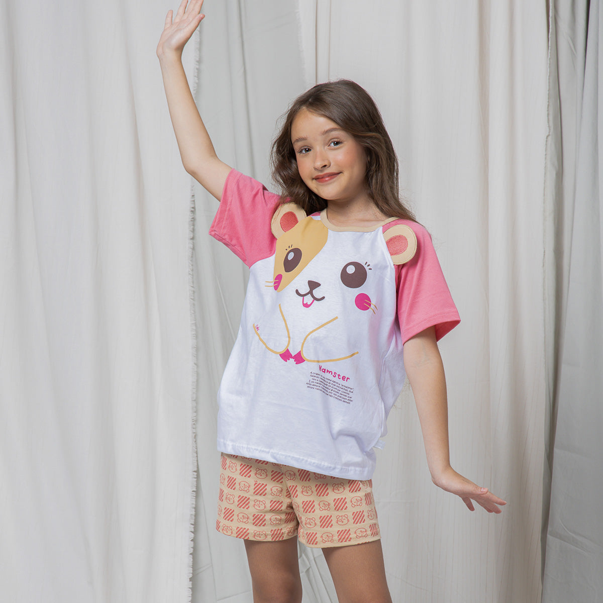 Pijama Bebê Cara de Criança Calça Hamster Branco e Rosa