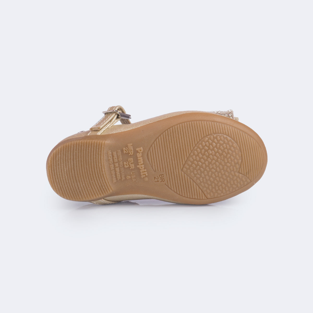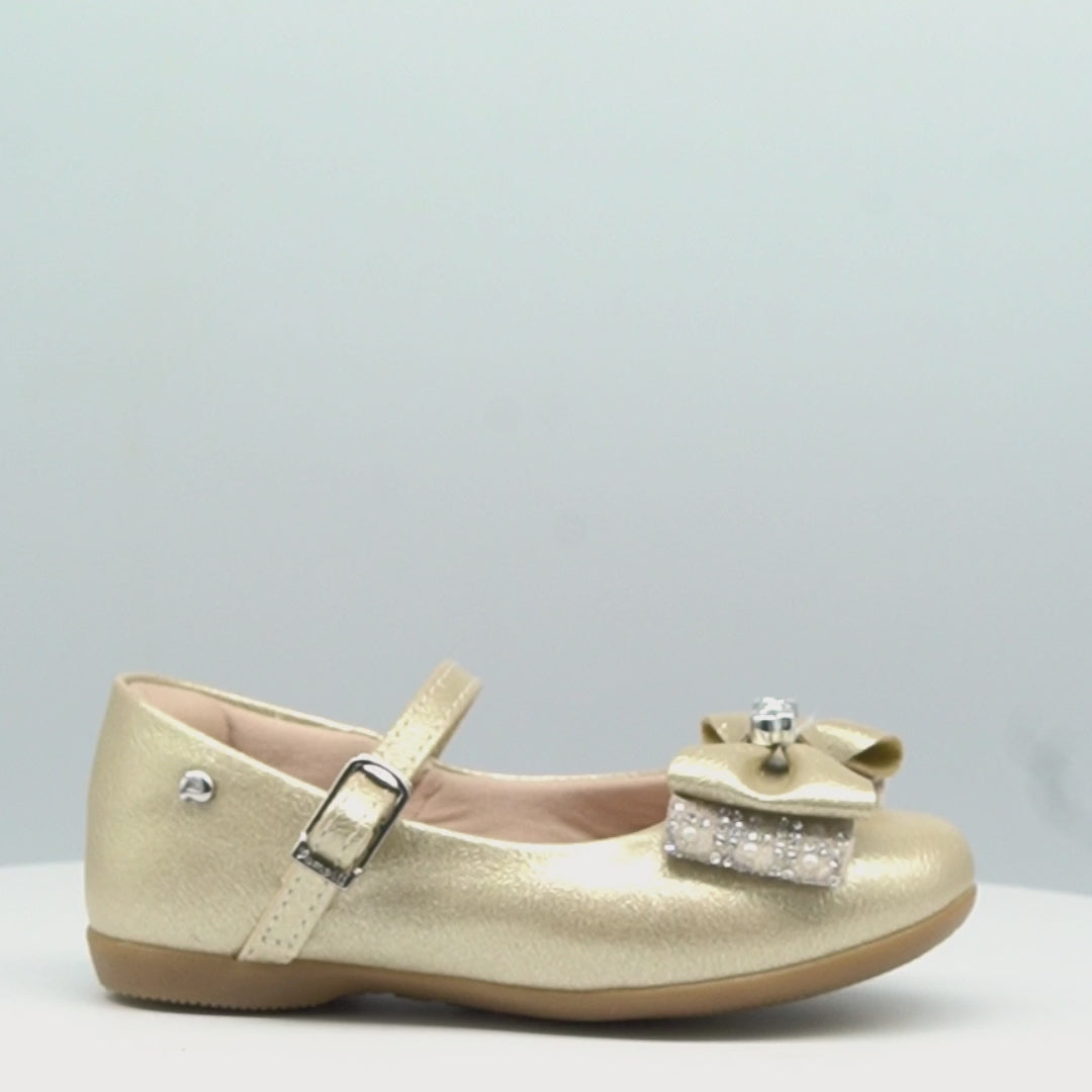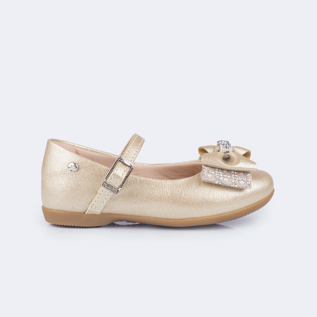 Modernidade e charme em cada detalhe! Este sapato metalizado dourado é a escolha perfeita para um visual clássico e encantador para as meninas. O design com bico arredondado e fechamento em fivela easy proporciona ajuste pratico e seguro, enquanto o laço com aplicação de strass, mini pérolas e enfeite em metal inoxidável prateado traz um brilho suave e moderno.