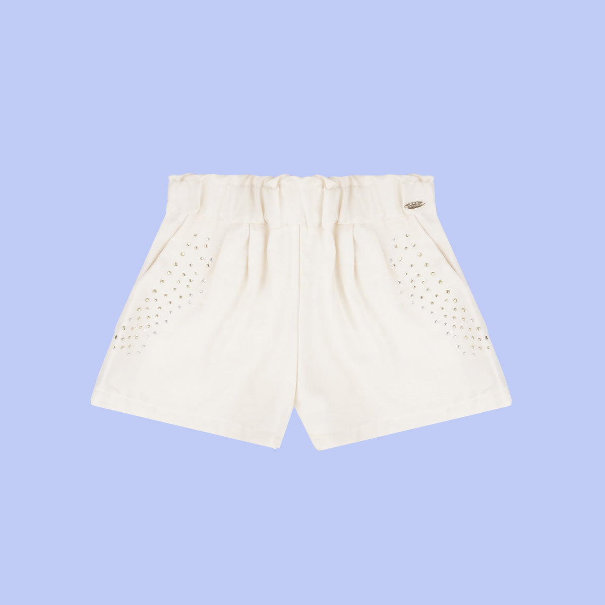 Charmoso e delicado, este shorts off white é perfeito para compor produções arrumadinhas com muito estilo. Confeccionado em tecido fluido, ideal para os dias mais quentes, garante leveza, frescor e um caimento elegante. Com cintura em elástico aumentando o conforto, possui bolsos com aplicações em strass dourado e prateado, que iluminam a peça com brilho sutil. Versátil e moderno, é a escolha certa para ocasiões especiais ou para composições casuais mais caprichadas.