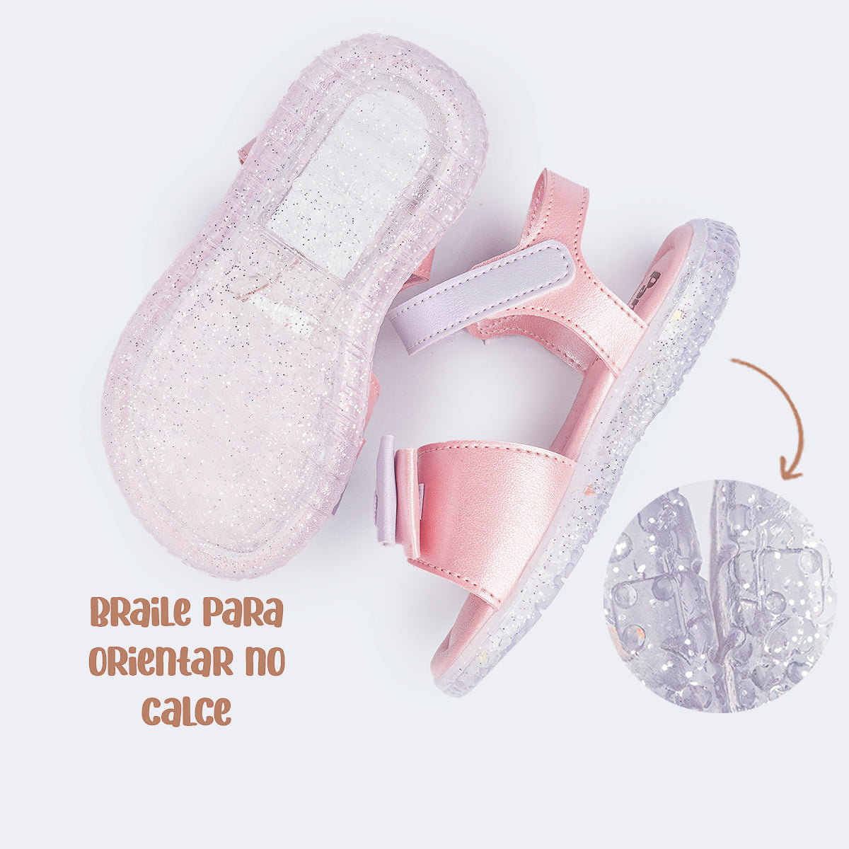 Pensada para as pequenas, essa sandália infantil tem duplo fecho de contato para ajuste personalizado e confortável no pezinho, além de palmilha anatômica acolchoada e solado antiderrapante transparente com glitter, resistente e charmoso. Possui também marcação em braile no solado, reforçando o cuidado com a inclusão.