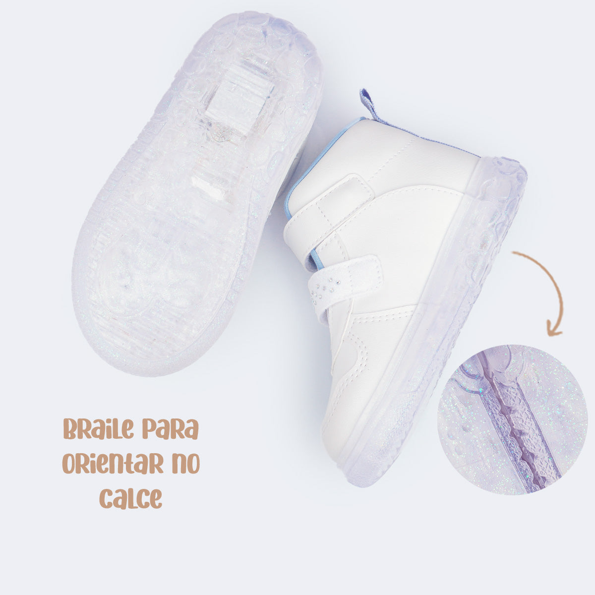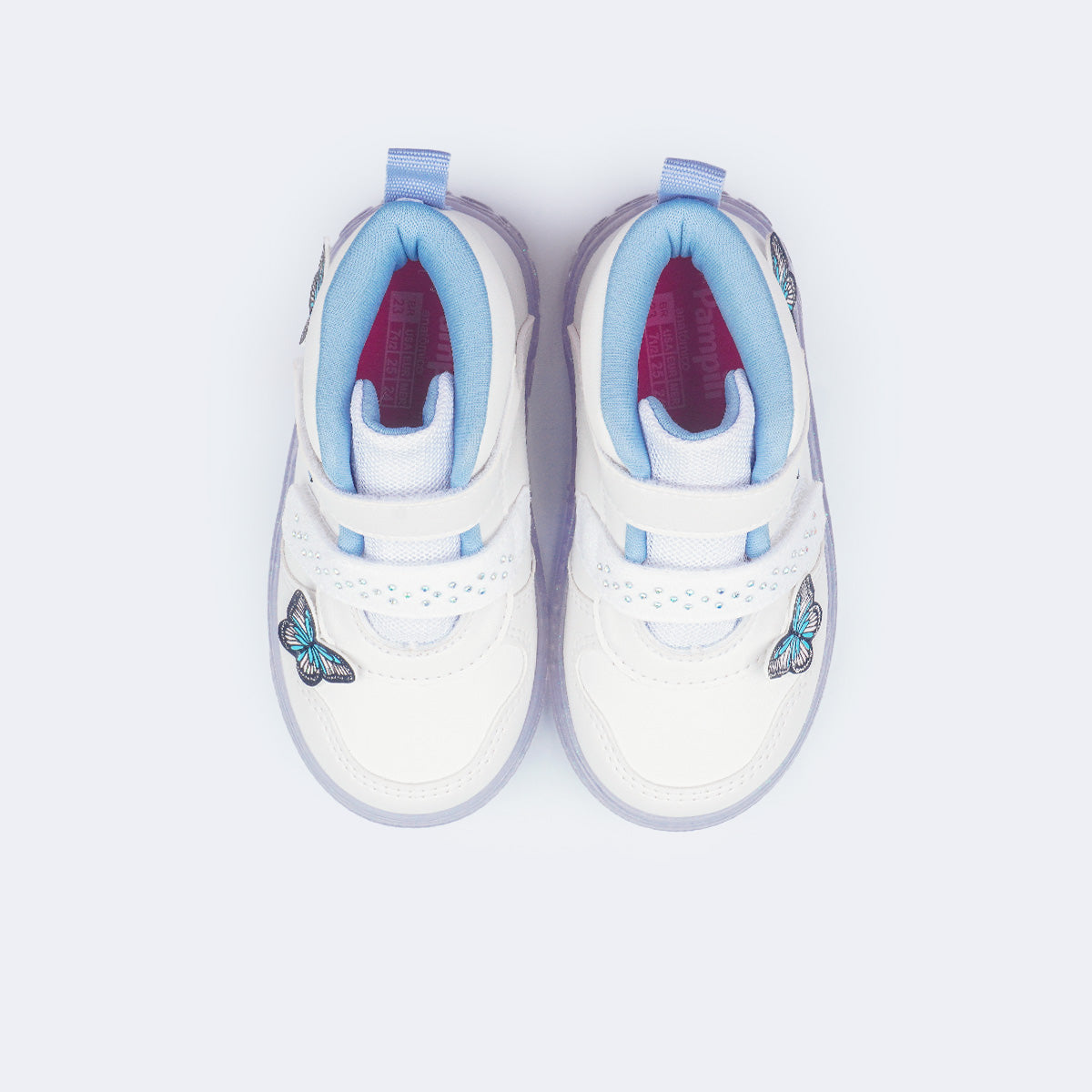 Tênis de led infantil branco e azul, ideal para acompanhar os primeiros passos com conforto e segurança. O modelo possui cano médio, aplicações de borboletas 3D em alto-relevo com glitter e strass furta-cor, além de solado transparente com glitter e luzes de LED brancas, que deixam o visual delicado e divertido.