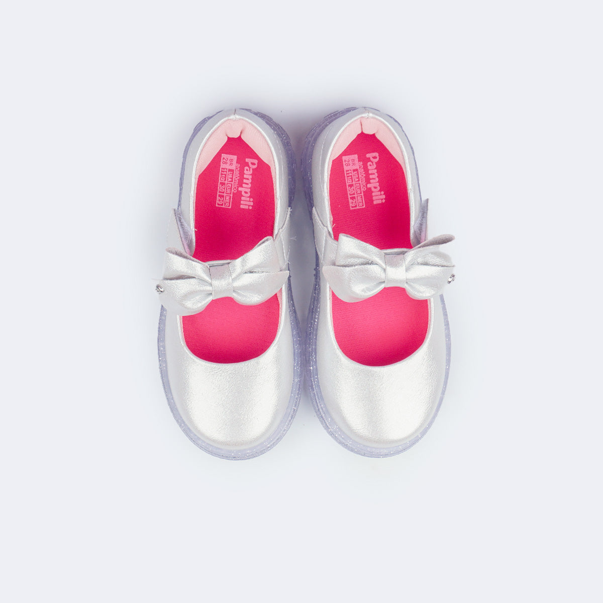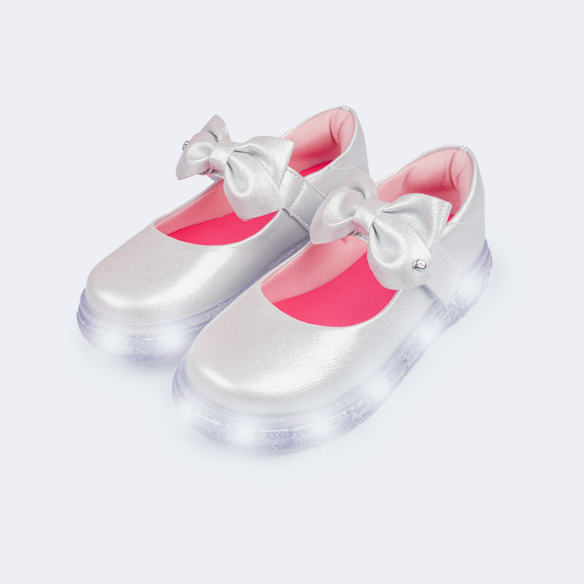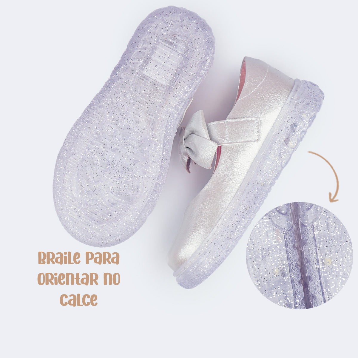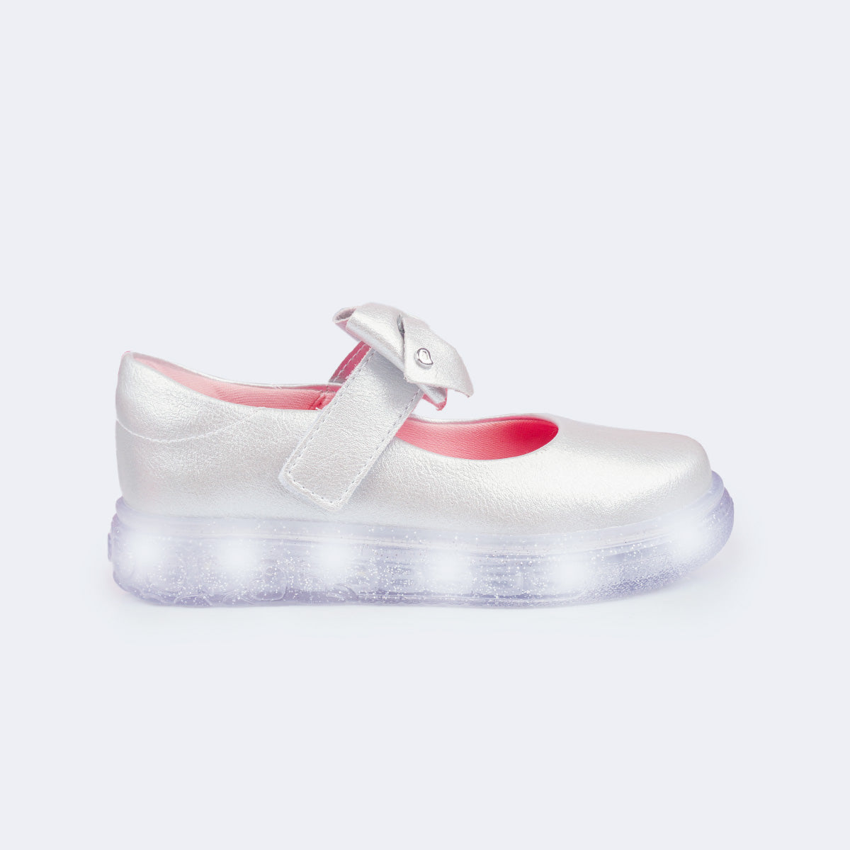 Tênis de led infantil Mary Jane prateado com laço delicado, perfeito para meninas que amam brilho no dia a dia. O modelo é forrado em tecido absorvente de suor, possui colarinho comfy almofadado e palmilha anatômica, garantindo bem-estar extra para os pezinhos.