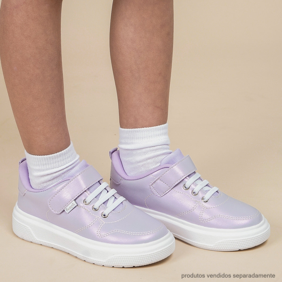 Tênis infantil modelo XP24 na cor lilás com laminado perolado, perfeito para meninas que gostam de um visual moderno com um toque de cor. Feito em material sintético resistente e fácil de limpar, tem acabamento com costuras que dão charme ao modelo.