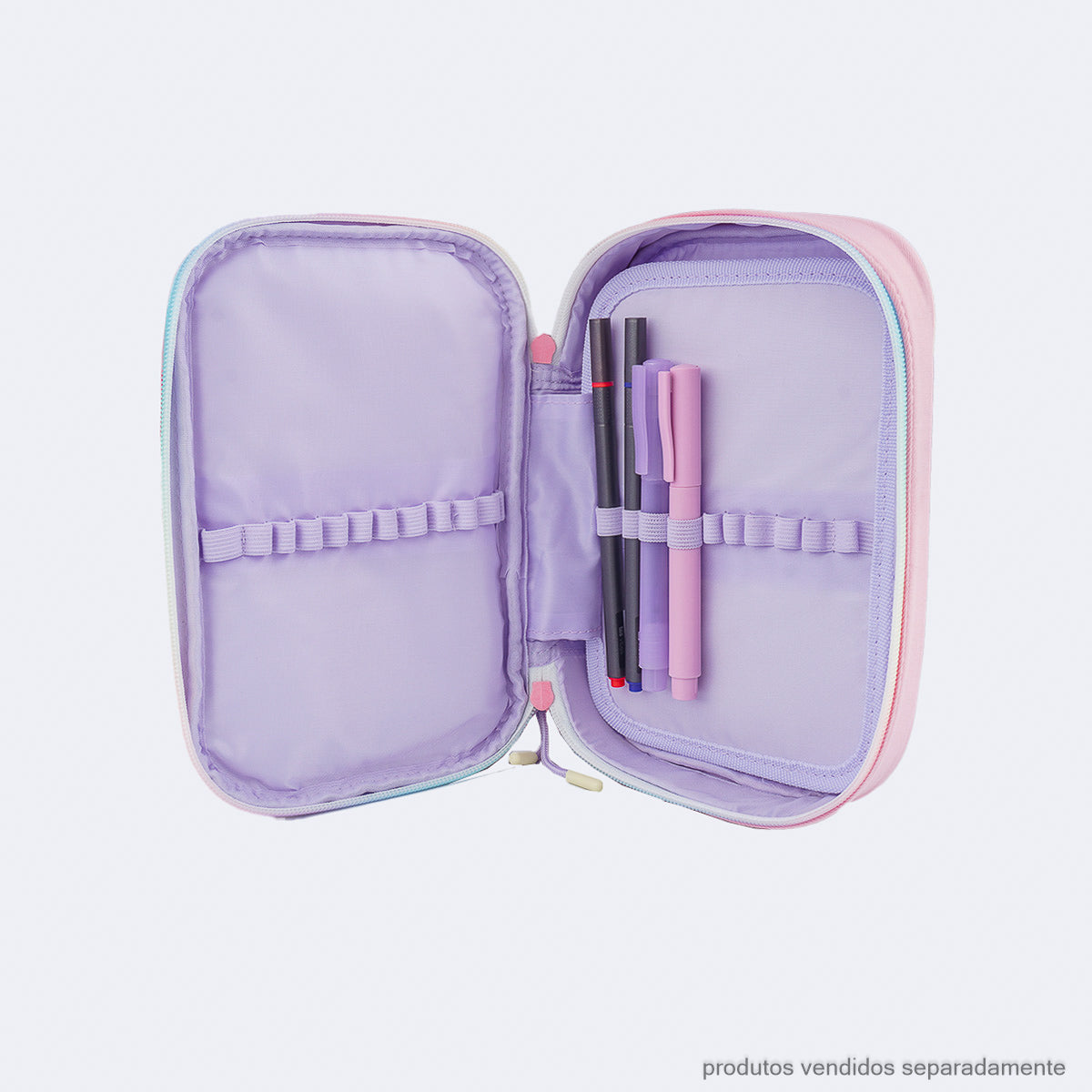 Seu interior estruturado conta com elásticos organizadores que mantêm lápis, canetas e acessórios sempre no lugar, ideal para meninas que gostam de tudo bem arrumadinho. O fechamento em zíper facilita o acesso aos dois compartimentos internos, enquanto o formato box oferece excelente capacidade sem perder a leveza. Um estojo completo, resistente e funcional, pensado para acompanhar todos os dias de aprendizado com charme e eficiência.