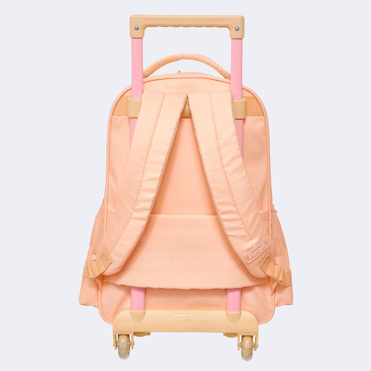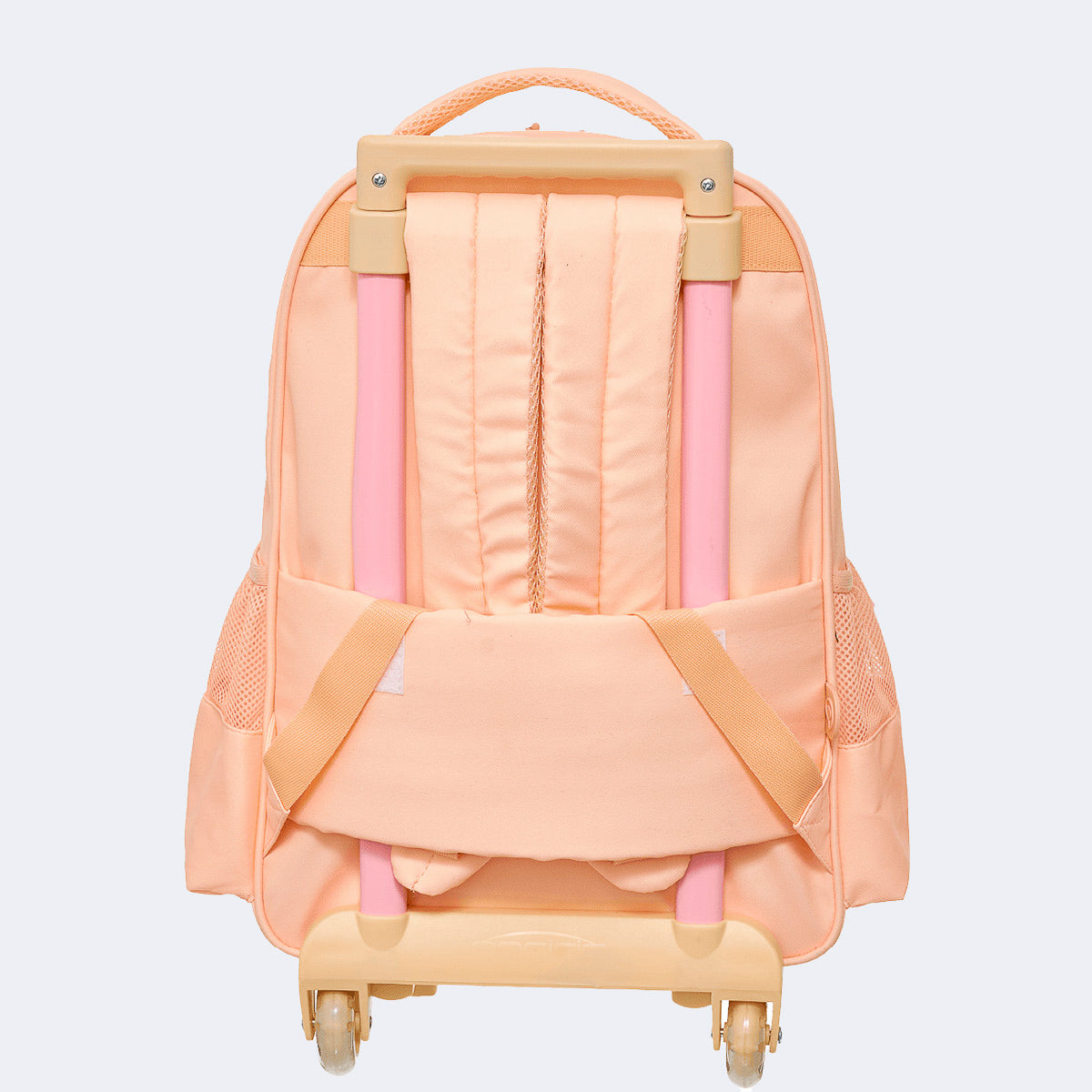 Mochila de rodinhas infantil escolar salmão com tecido comfy holográfico e costuras em formato de corações. Projetada para desempenho e durabilidade no dia a dia escolar, esta mochila oferece capacidade total de 18 litros, com estrutura resistente suportando até 5 kg de materiais. Fabricada em poliéster de alta densidade (300D), o modelo garante excelente performance em uso contínuo. A versão com rodinhas é equipada com carrinho em alumínio e puxador com regulagem de altura, que facilita o transporte e acompanha o crescimento das meninas.