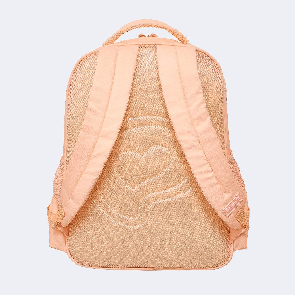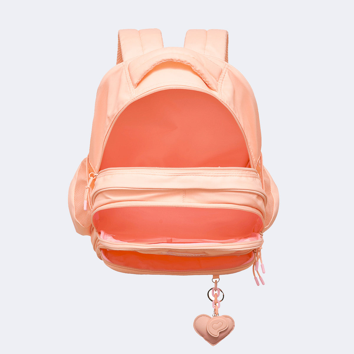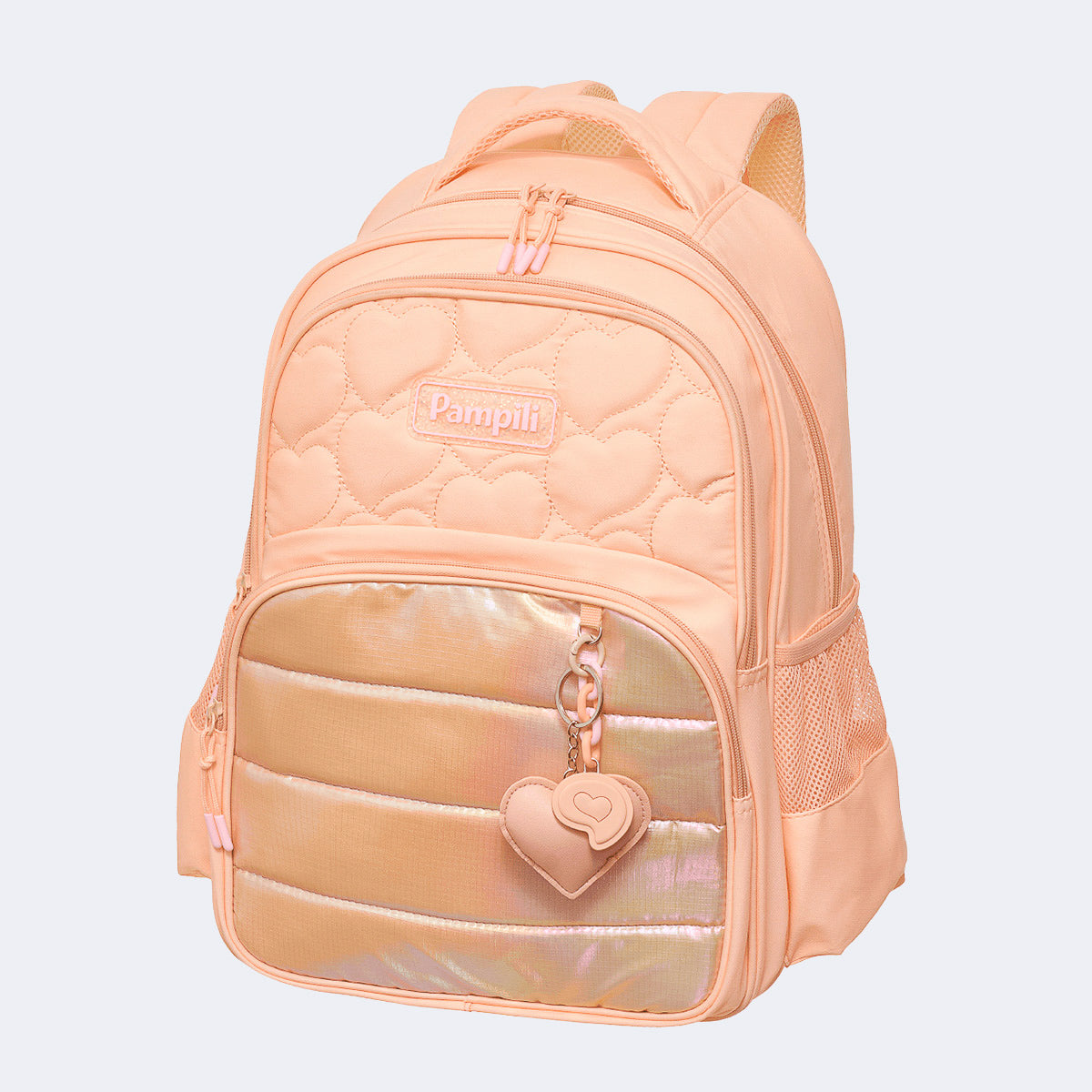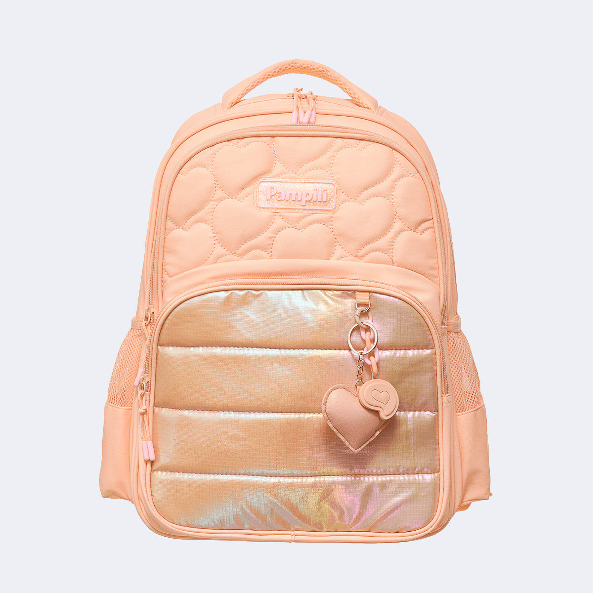 Mochila escolar infantil salmão com tecido comfy holográfico e costuras em formato de corações. Projetada para desempenho e durabilidade no dia a dia escolar, esta mochila oferece capacidade total de 18 litros, com estrutura resistente suportando até 5 kg de materiais. Fabricada em poliéster de alta densidade (300D), o modelo garante excelente performance em uso contínuo.