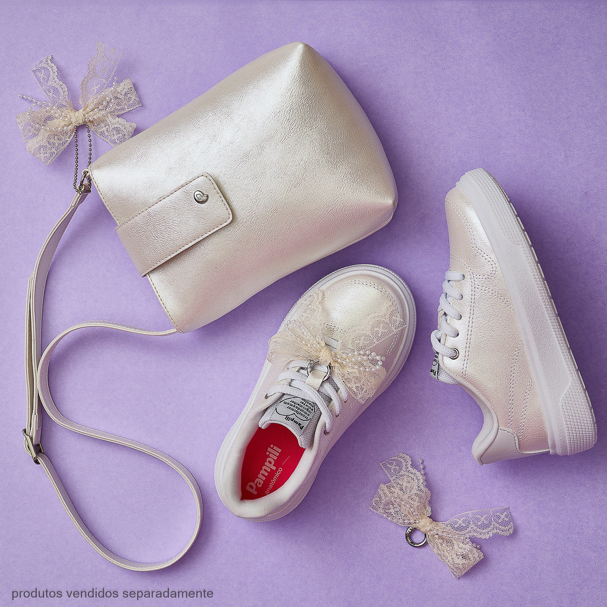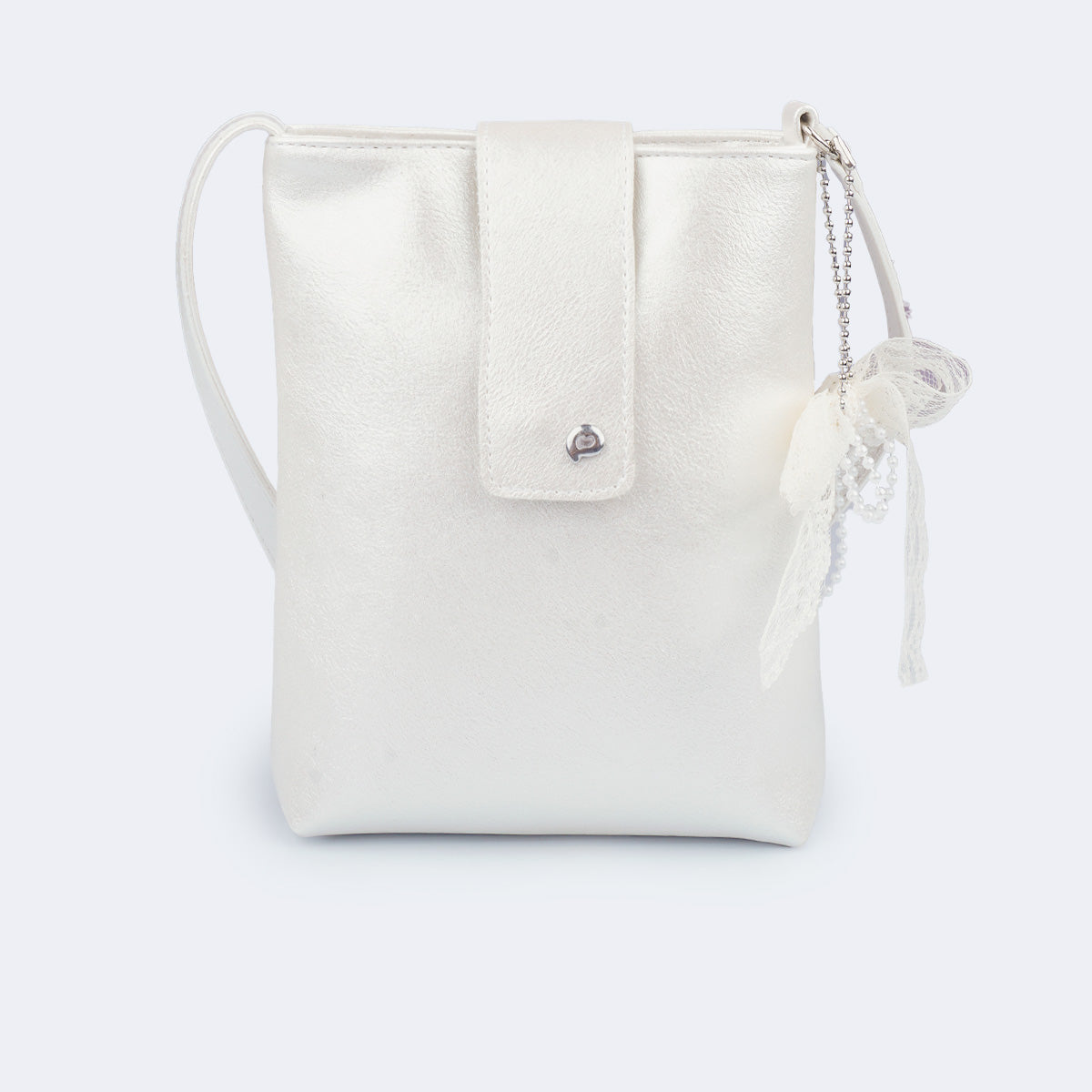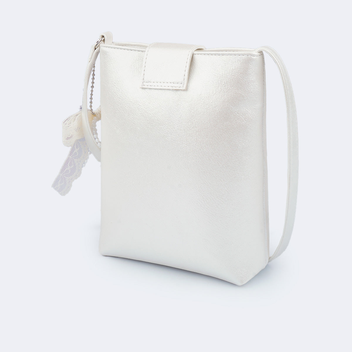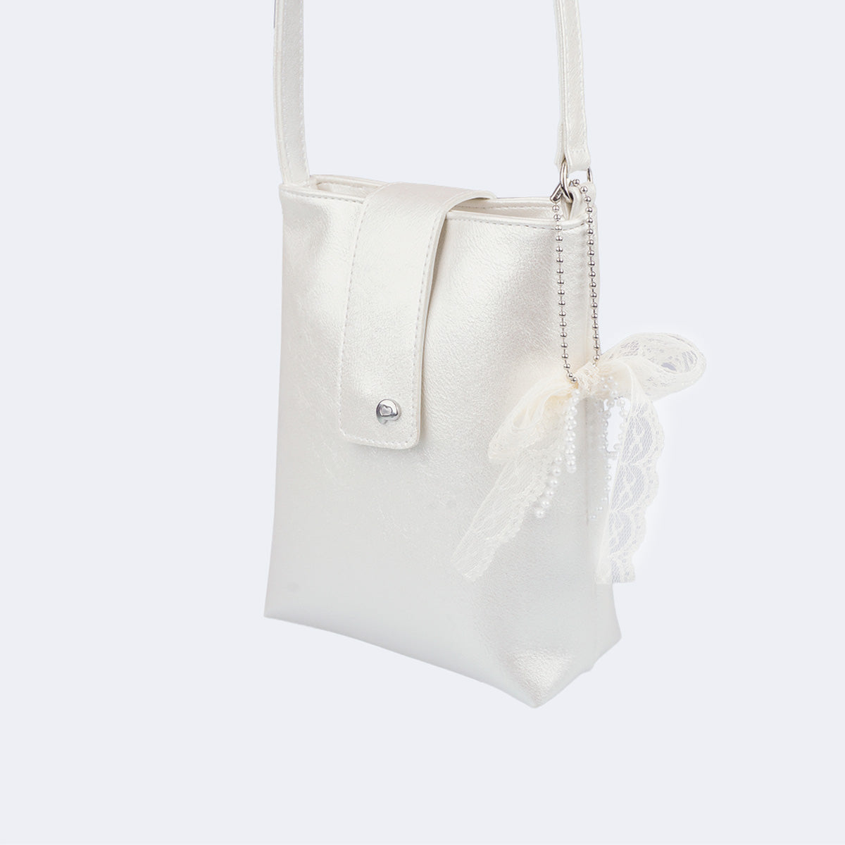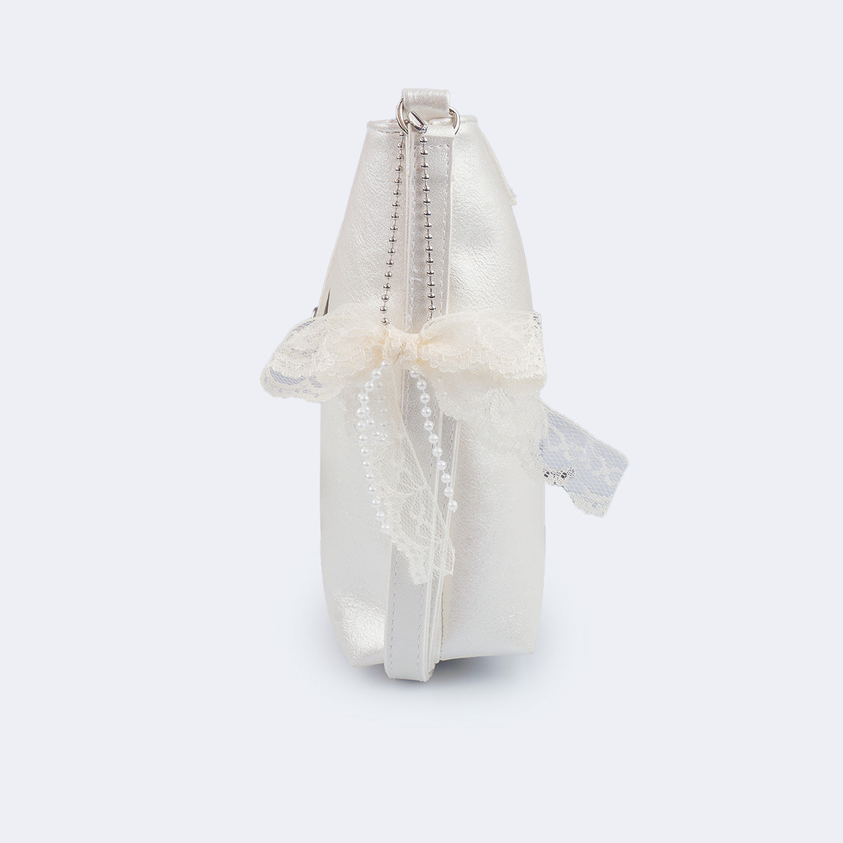 Seu design minimalista ganha destaque pelo brilho perolado do material e pelo chaveiro de laço em renda com pérolas, que pode ser removido e usado de outras formas. O modelo conta com fecho duplo, magnético e de correr, garantindo segurança e praticidade no dia a dia.