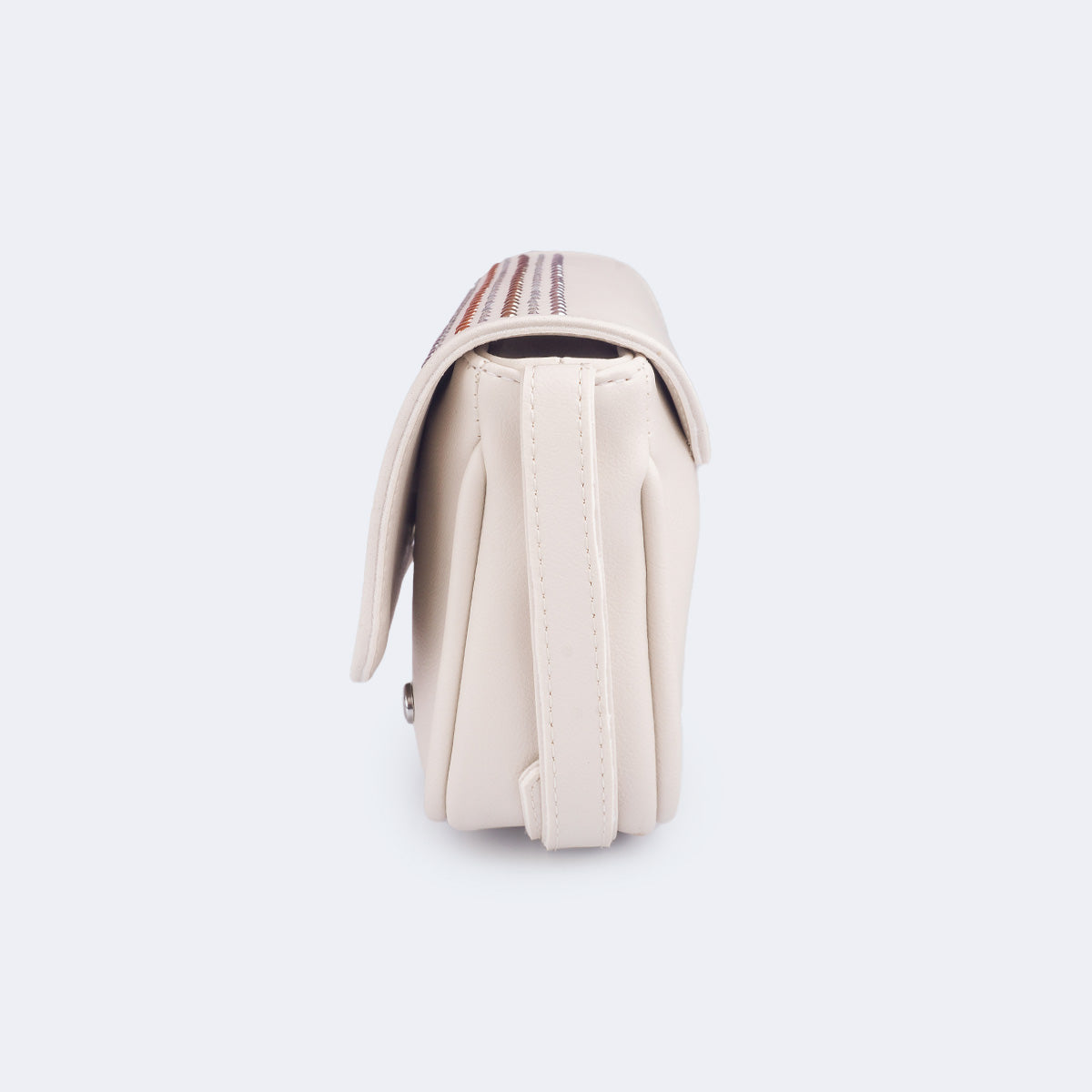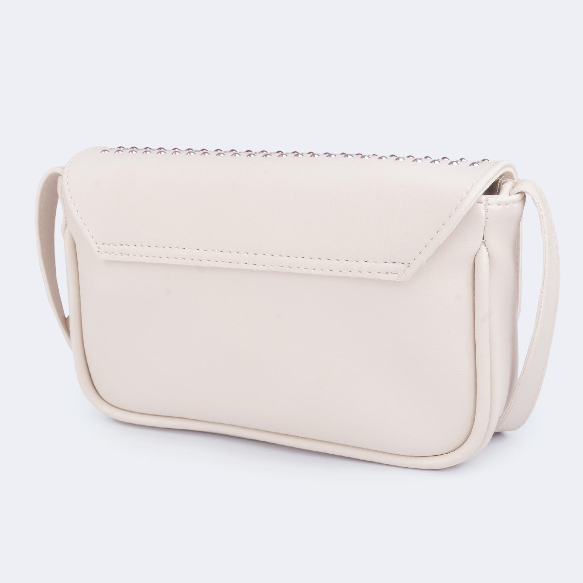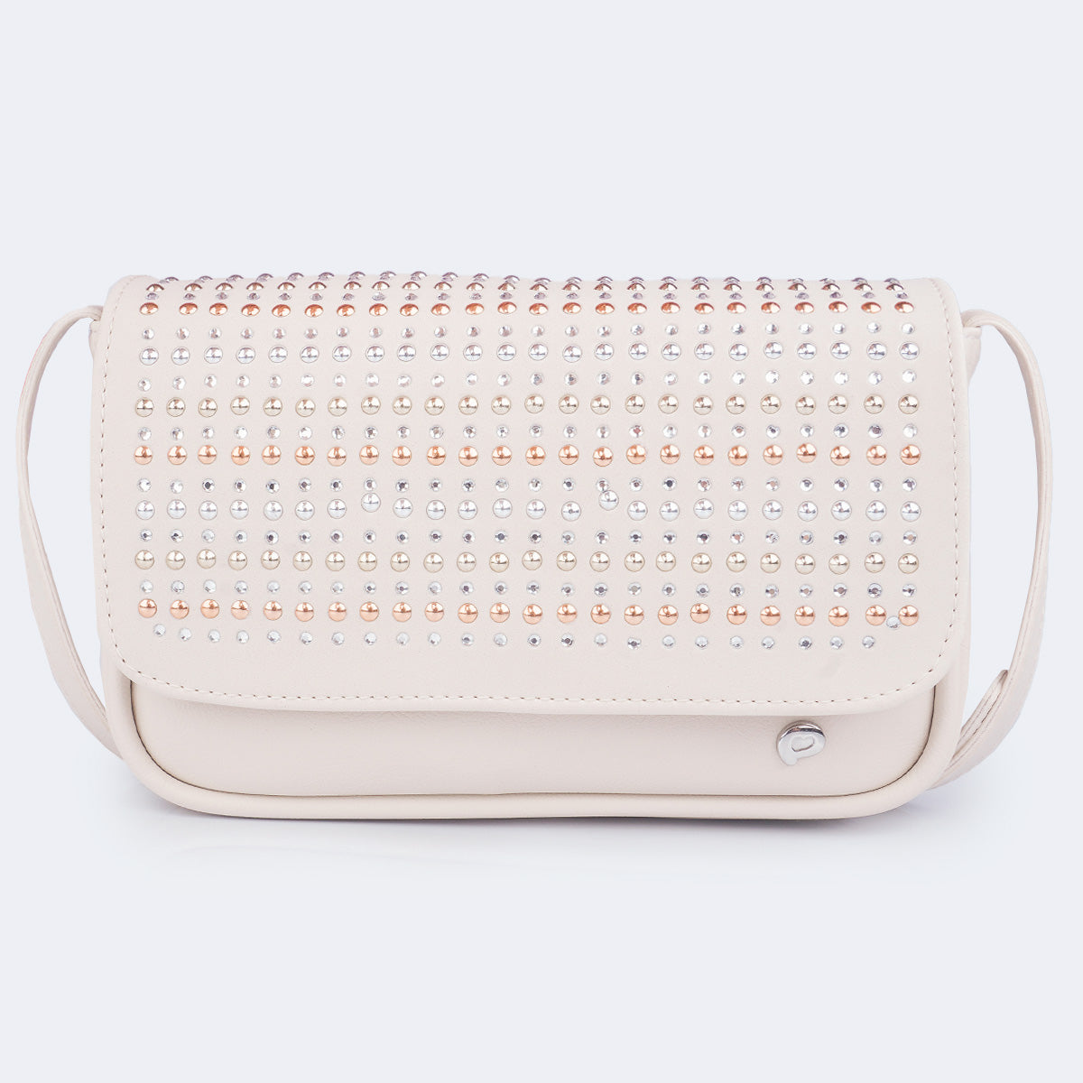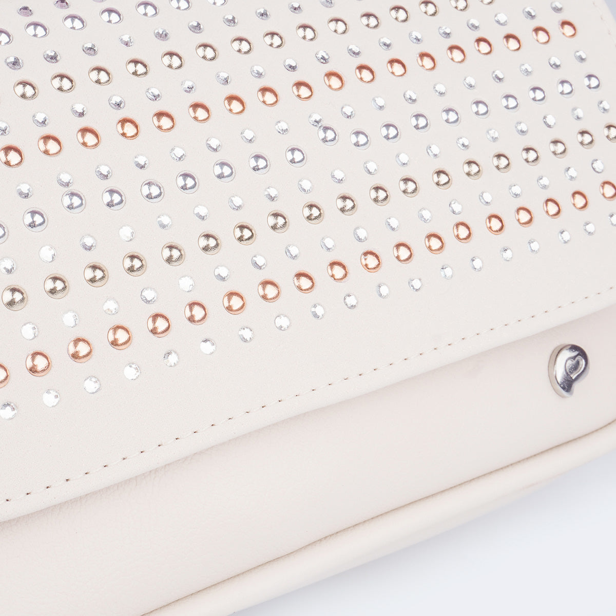 Com acabamento em tom off white e aplicação de mini strass e tachas metálicas nas cores dourado, rosé e prata, o modelo traz um brilho delicado e elegante, perfeito para celebrações e momentos especiais.