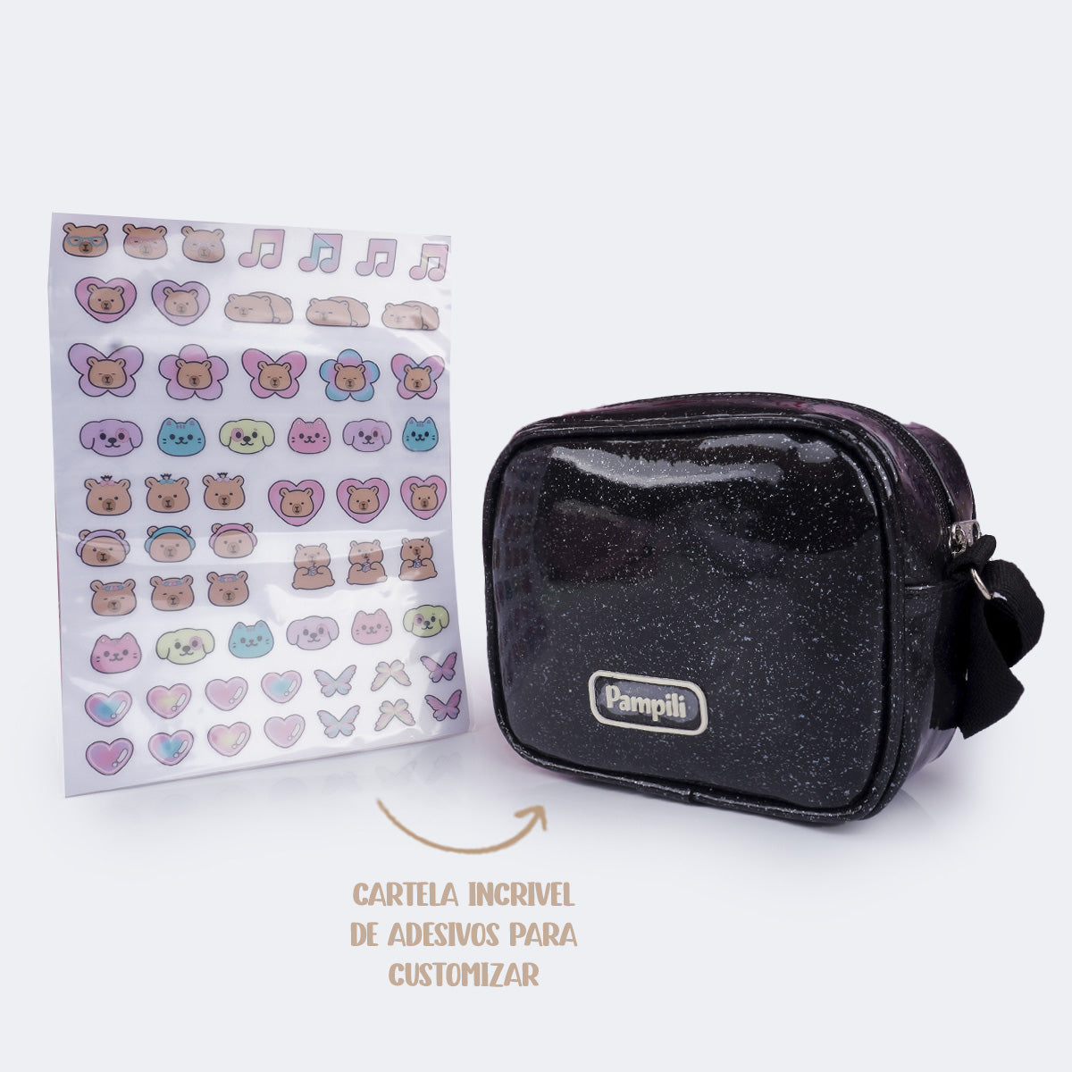 Para deixar tudo ainda mais divertido, acompanha uma cartela de adesivos exclusivos que permitem personalizar a frente da bolsa e criar diferentes combinações do jeitinho que quiser.