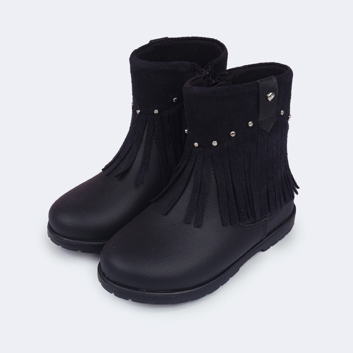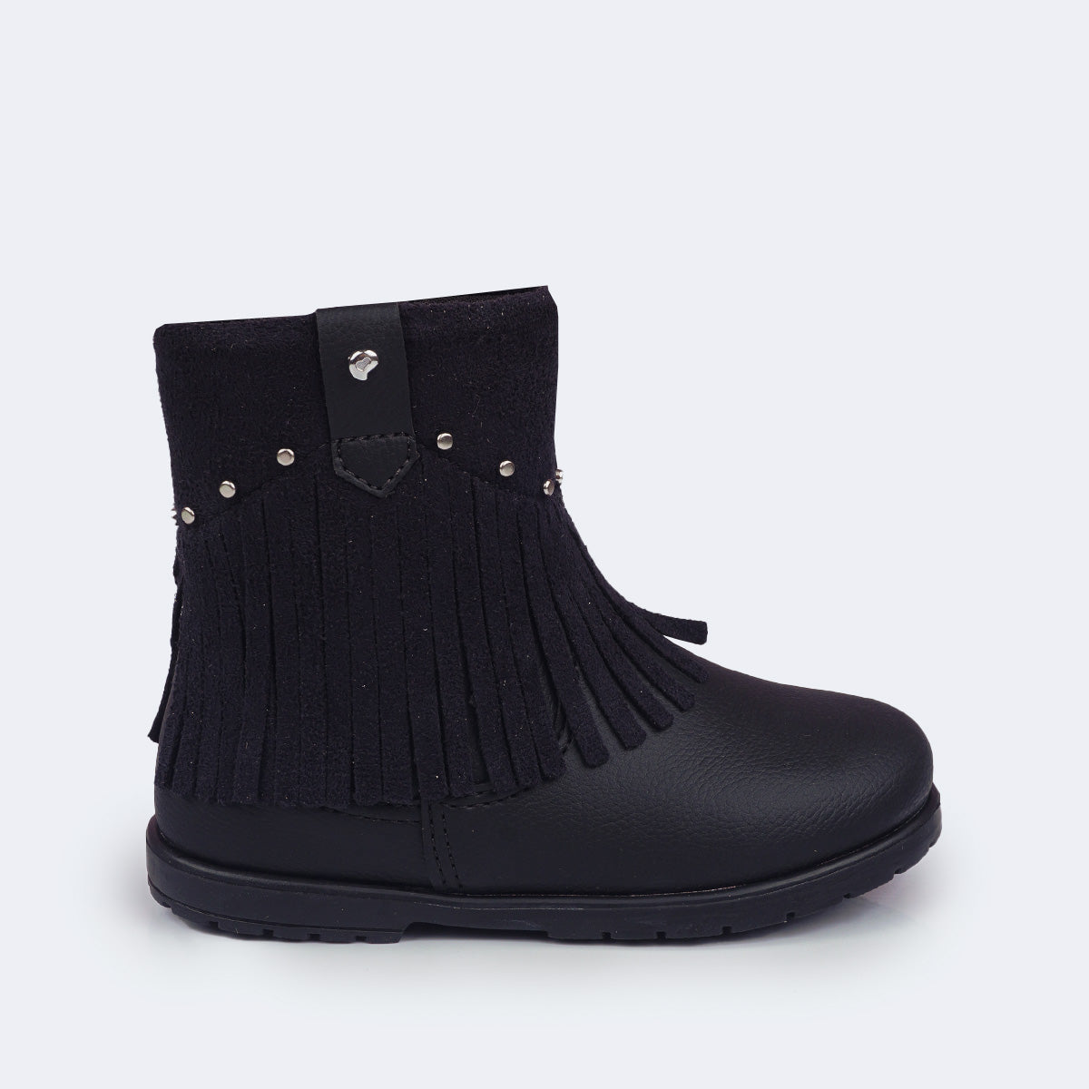Com pegada western na medida, esta bota com franja infantil para menina traz um visual delicado e atual, com cabedal preto liso, fácil de limpar e sobreposição em suede com franjas que se movimentam a cada passinho, além das tachinhas douradas que iluminam o look. É o tipo de bota de menina que deixa qualquer produção mais estilosa, sem perder a leveza que a rotina da menina pede.