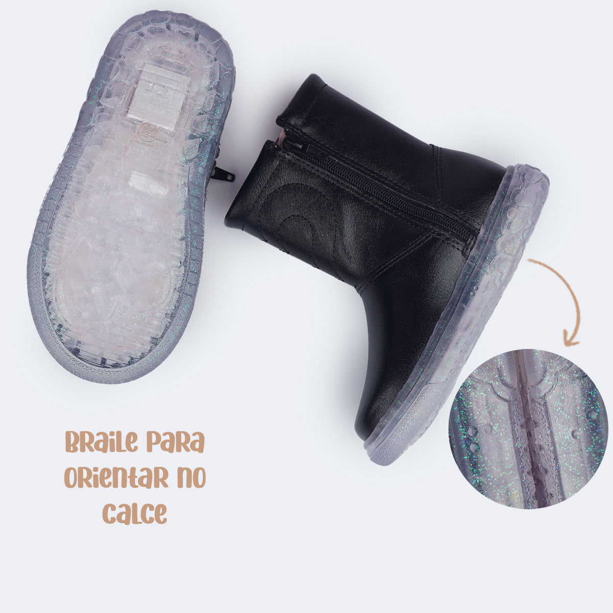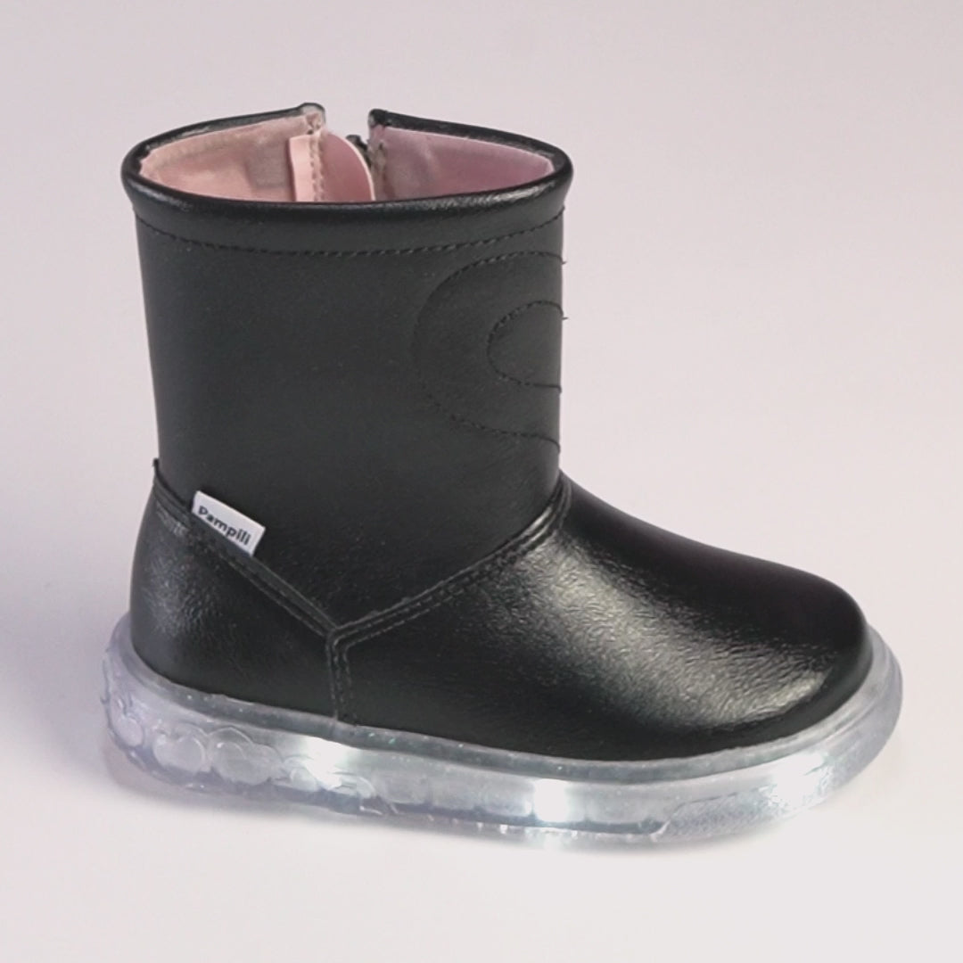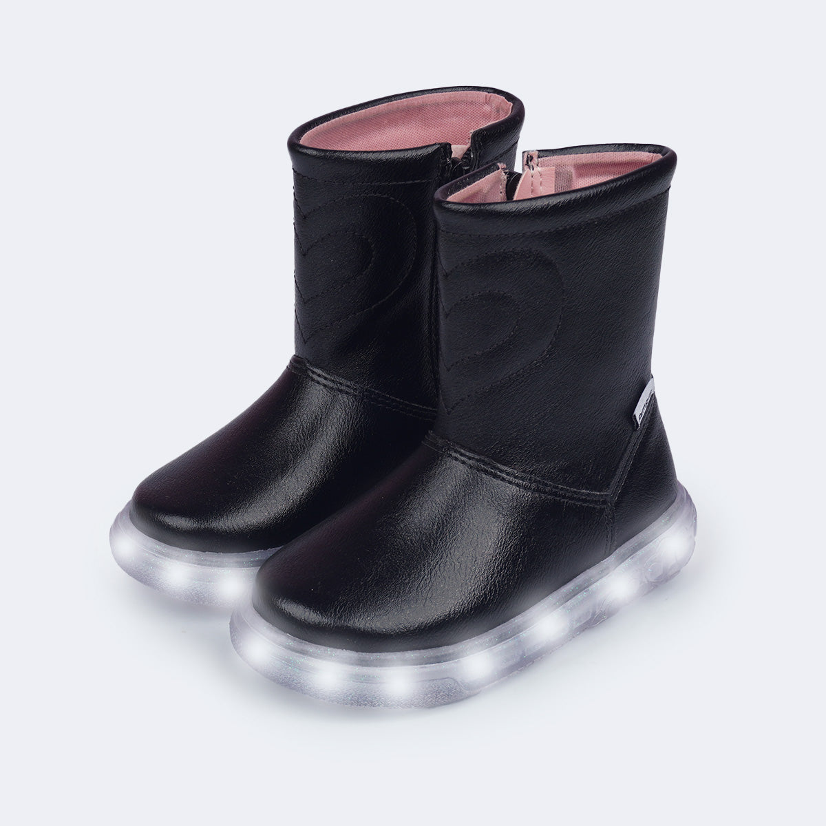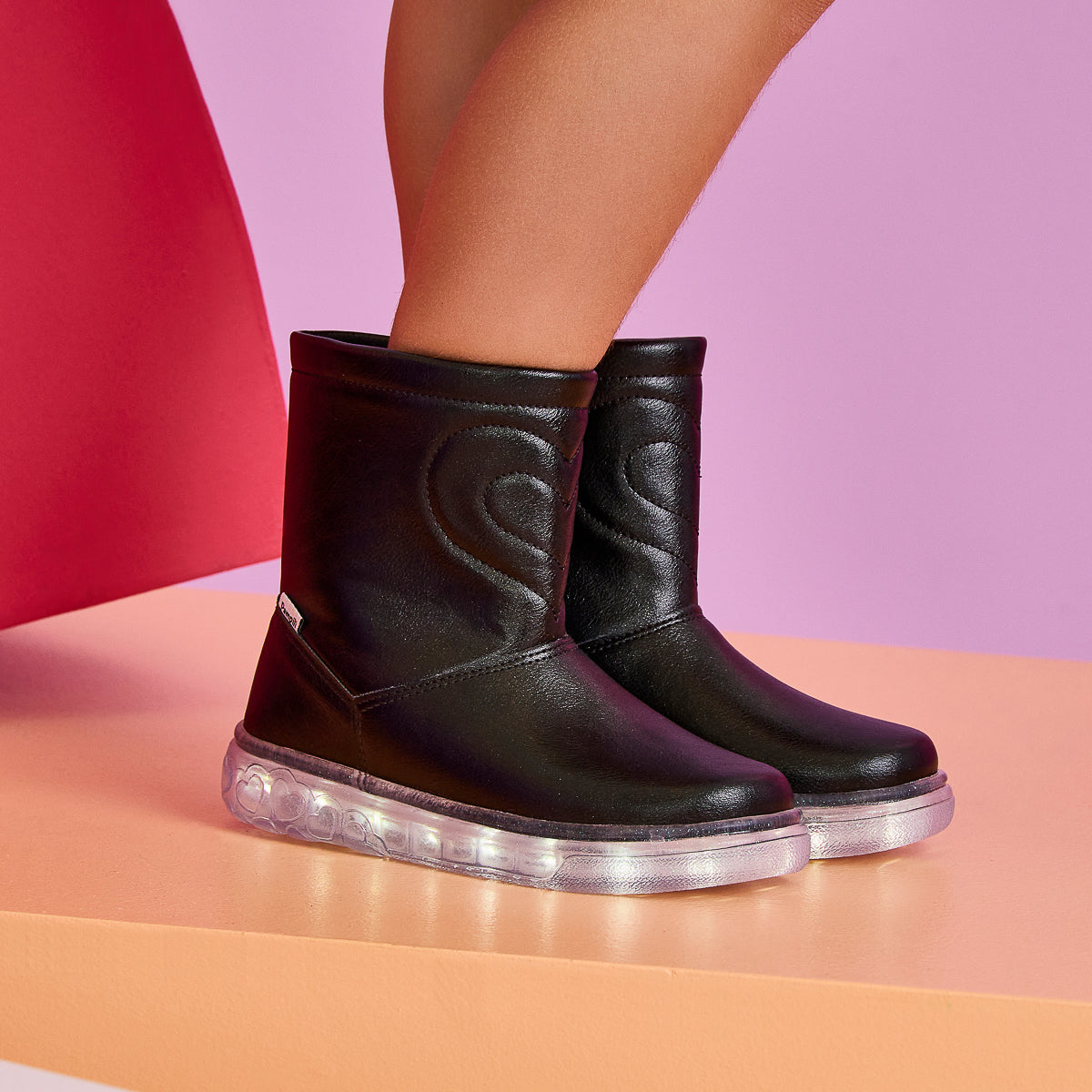 Esta bota de LED é a escolha perfeita para meninas que amam um calçado cheio de estilo! Seu acabamento liso cintilante proporciona um brilho suave e solado antiderrapante transparente texturizado com corações, repleto de glitter e iluminação em LED branco, transforma cada passo em brilho e encanto.