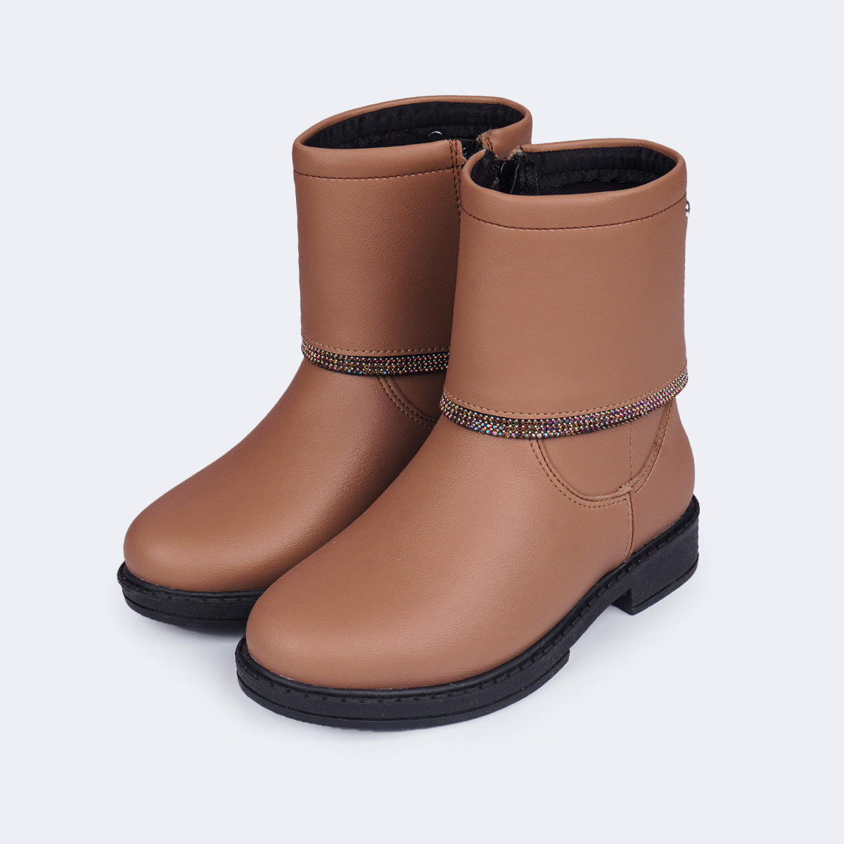 A bota infantil marrom de cano médio é aquela peça curinga que combina com tudo e deixa os looks de inverno ainda mais estilosos. Com design liso e clássico inspirado na bota de montaria, ela traz um toque sofisticado com detalhe em strass no cano e leve saltinho de 2,5 cm que completa o design com um toque moderno, sem perder o conforto ideal para o dia a dia das meninas