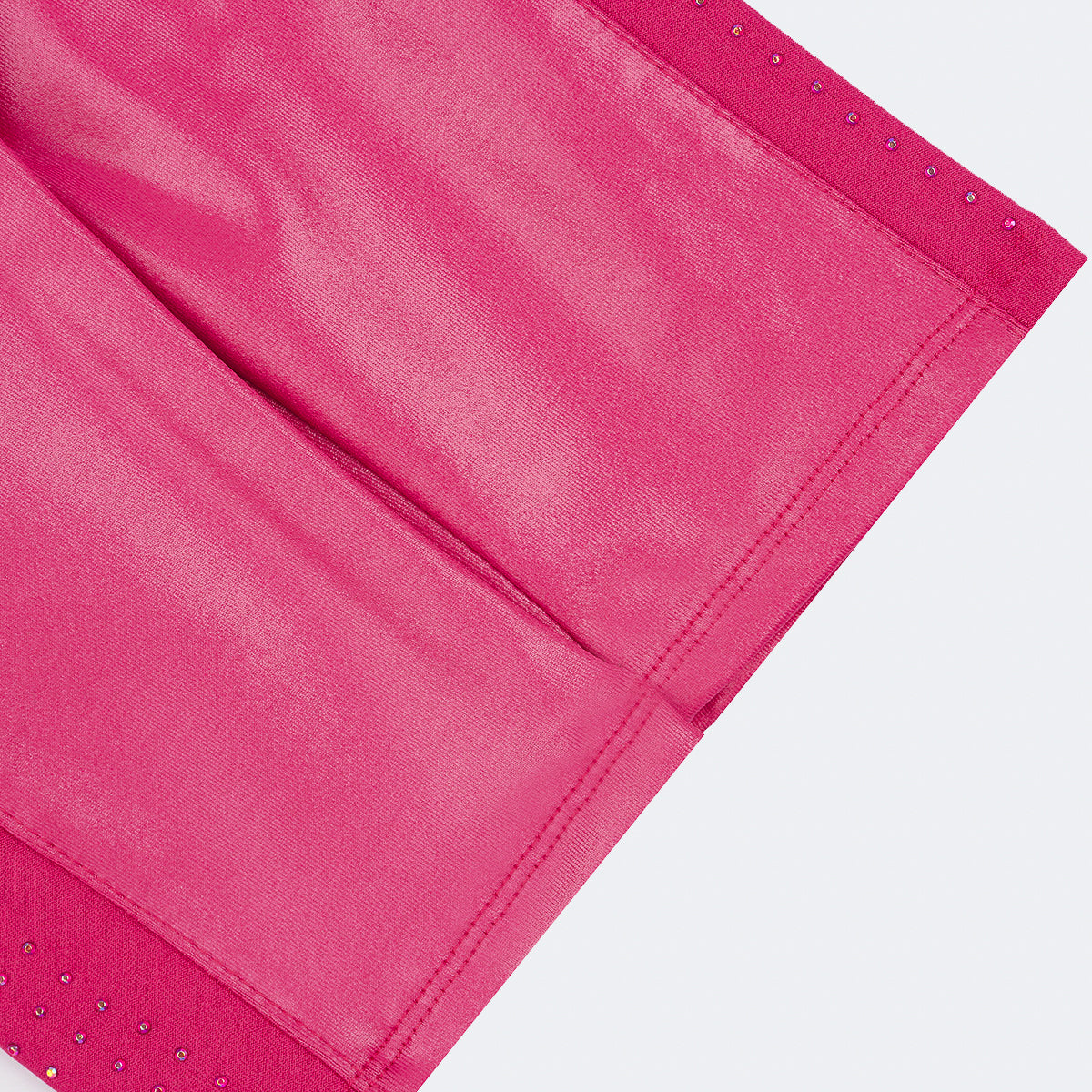 Calça legging em poliéster acetinado pink, um tecido confortável que vai deixar a menina livre para brincar! Calça infantil com elástico na cintura. Detalhe lateral em tecido fosco e aplicações de strass horfix. Peça em metal dourado com strass Pampili na cintura. Calça maleável para a menina se divertir com estilo!