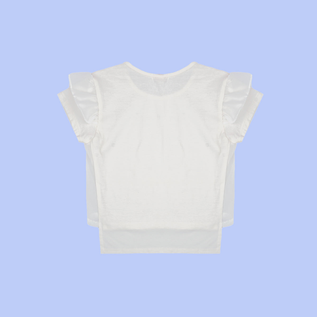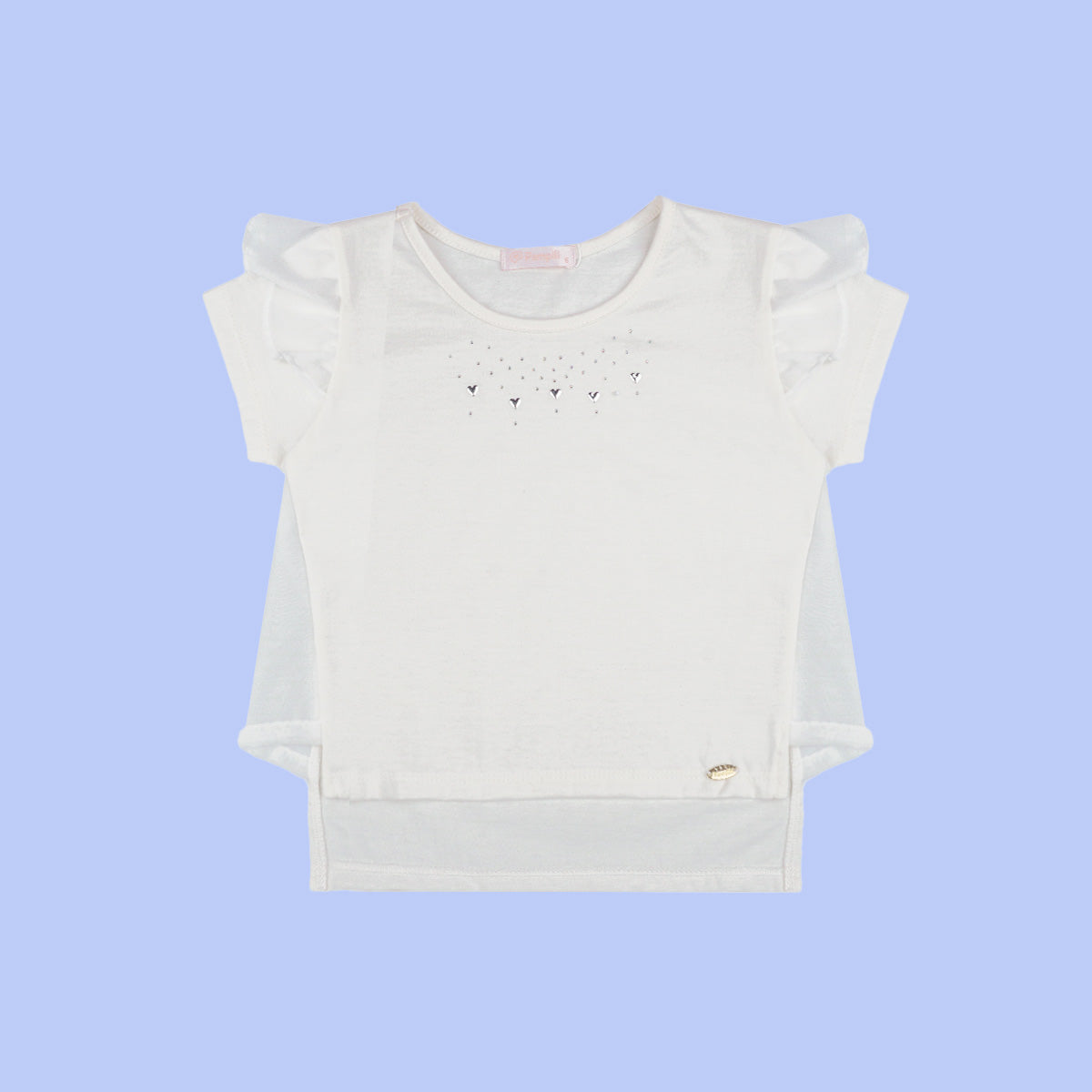 Camiseta infantil feminina branca confeccionada em algodão, com toque macio e excelente conforto para o dia a dia. O design delicado ganha charme extra com os babadinhos nas mangas e a leve transparência nas laterais, que trazem movimento e beleza ao visual.