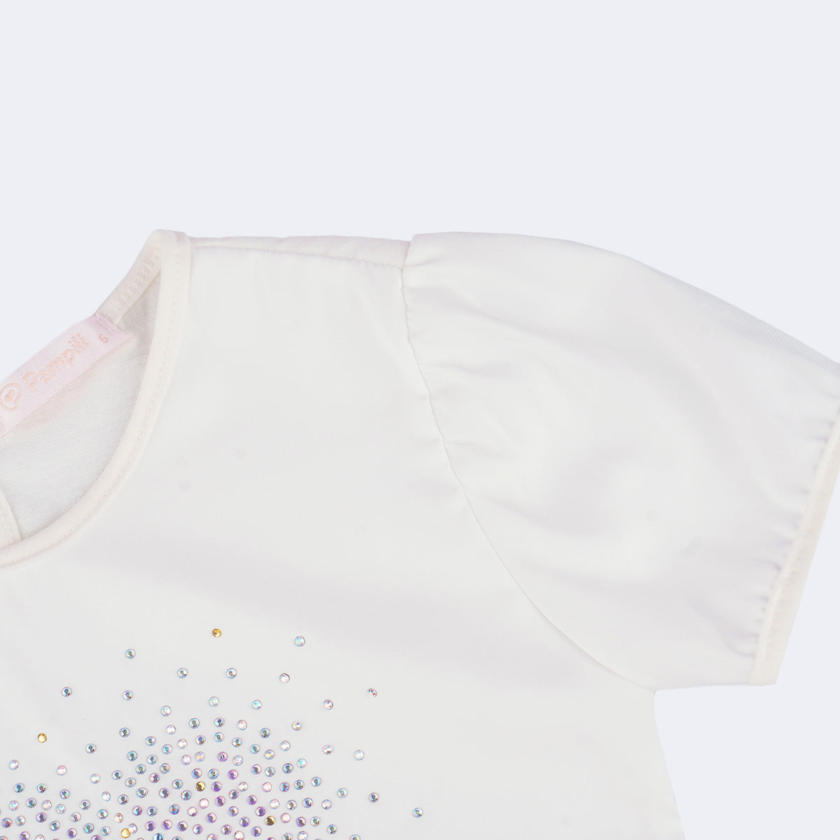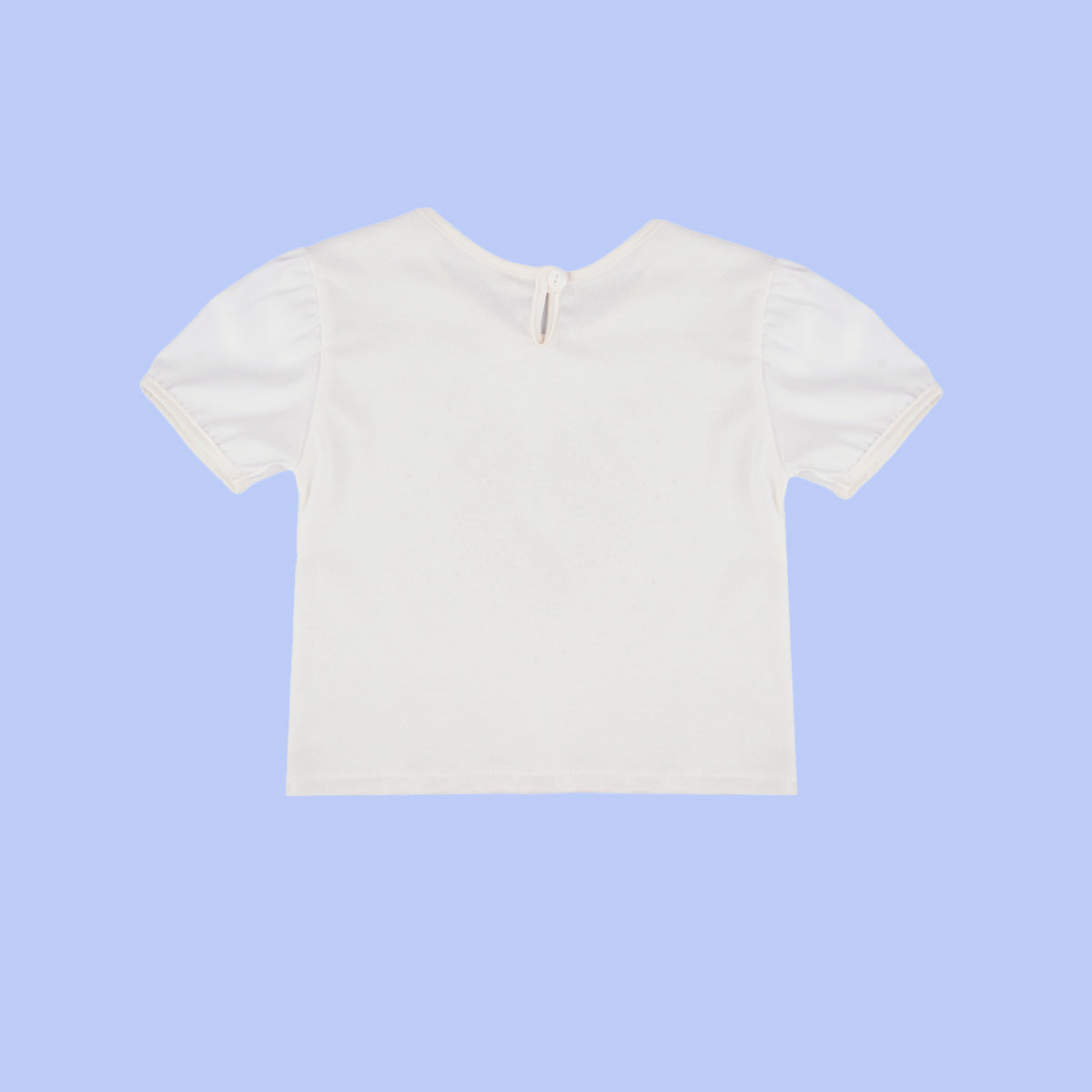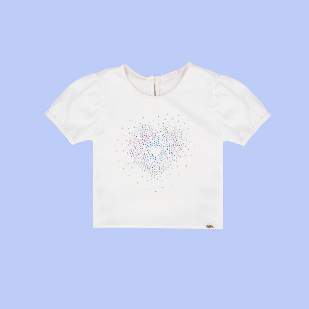 Para um look de menina com cuidado e charme, esse produto em off white aposta no brilho delicado de hotfix coloridos formando um coração no centro, criando destaque sem pesar. As mangas com acabamento suave deixam o visual mais especial, mantendo a proposta leve e moderna para a menina.