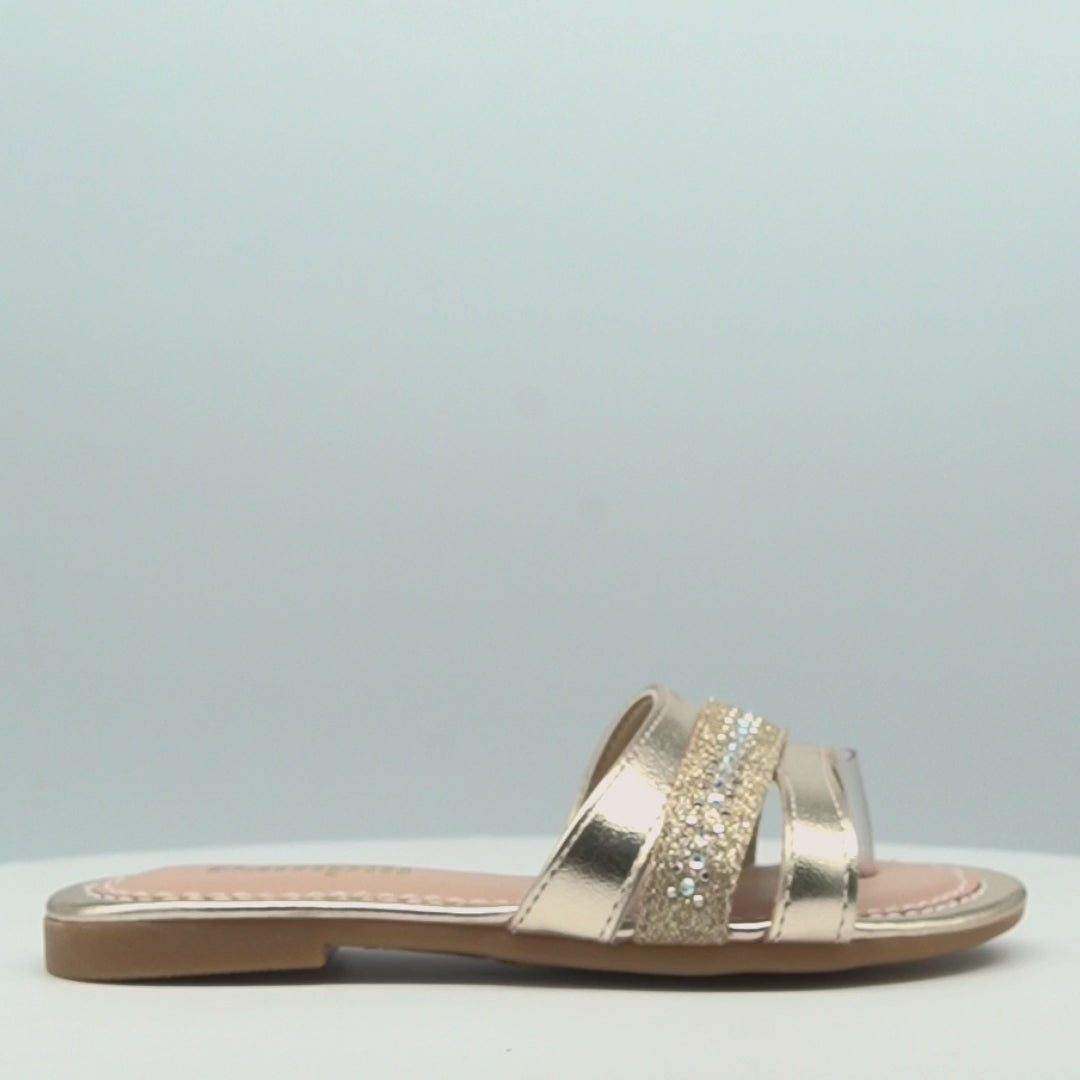 Sandália rasteira dourada com aplicação de glitter e hotfix. Rasteirinha infantil para menina, prática e confortável para o dia a dia.