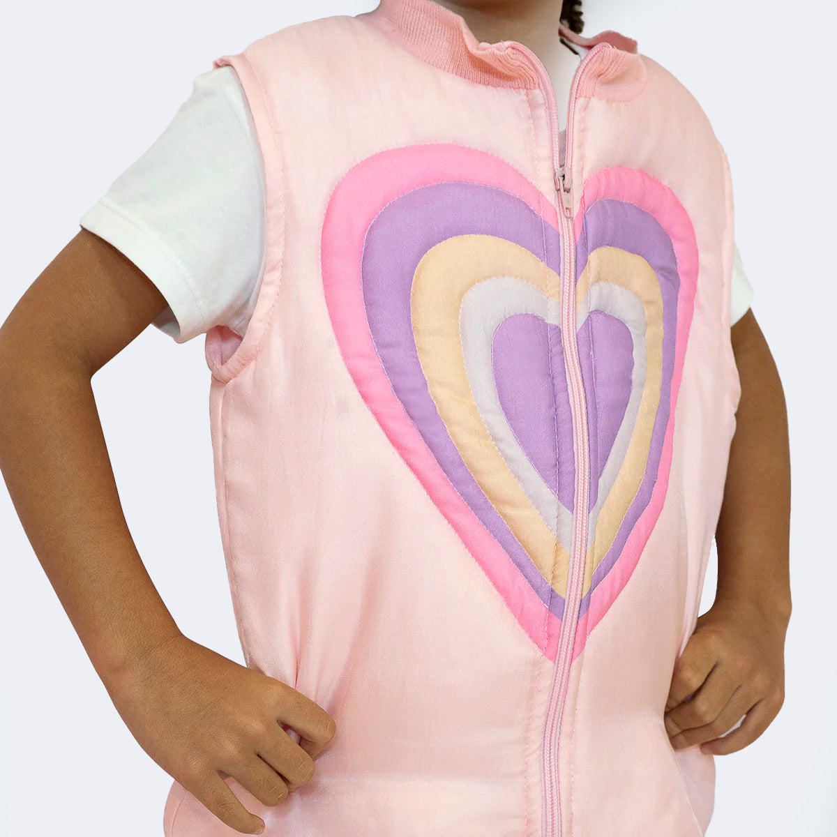 Colete infantil feminino em poliéster acolchoado rosa, super fofinho e aconchegante para a menina arrasar no inverno. O colete tem costuras frontais que formam um coração colorido, um modelo super estiloso! Colete com fechamento em zíper na parte frontal. Peça em metal dourado Pampili na barra.