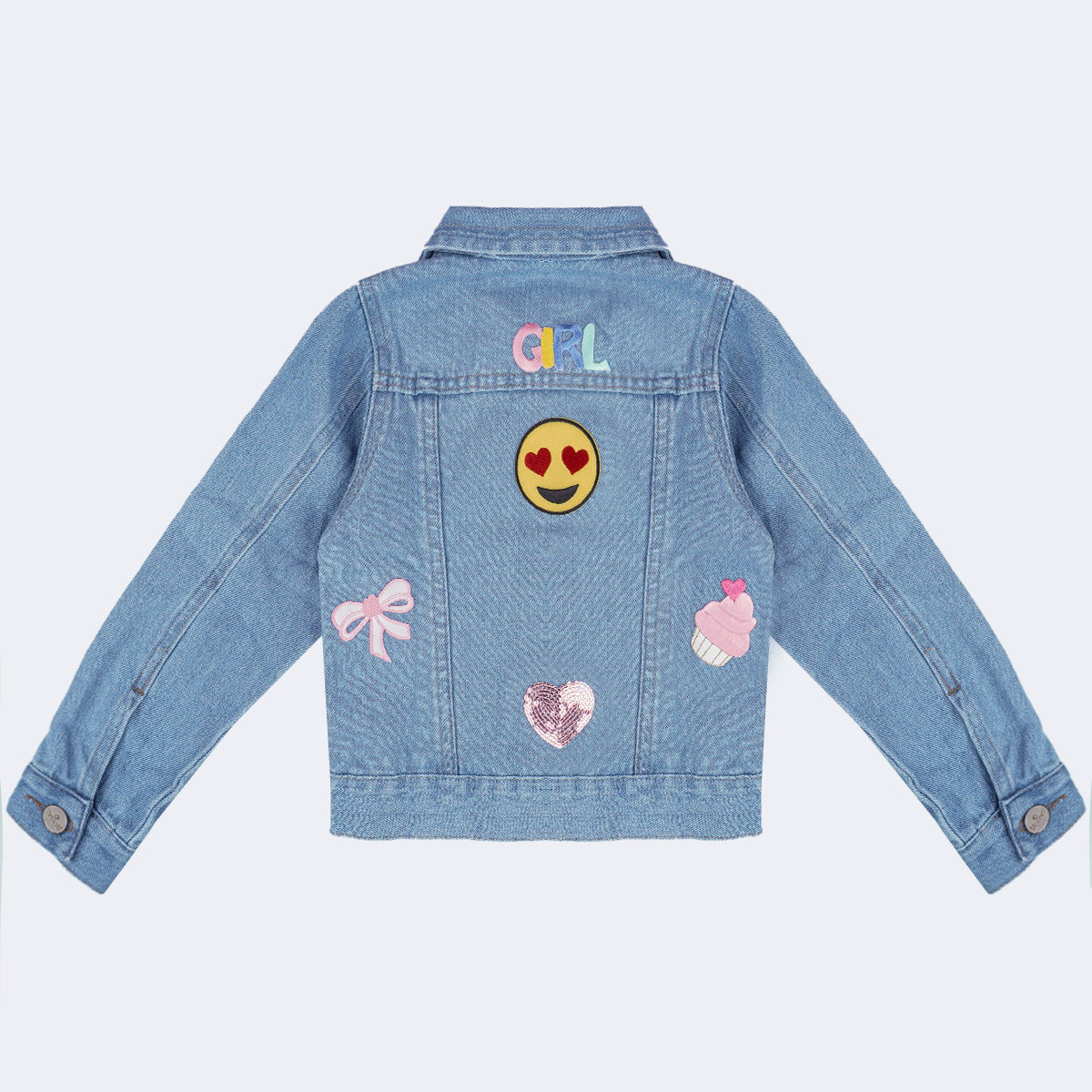 Jaqueta jeans infantil azul confeccionada em algodão, com toque macio e caimento estruturado que garante conforto e estilo em todas as estações do ano. O modelo possui fechamento frontal e nos punhos por botões metálicos personalizados Pampili, bolsos fake que reforçam o visual clássico da peça e patches coloridos aplicados nas costas com mix de laço, cupcake, coração em paetê, emoji e lettering “GIRL” que trazem personalidade, alegria e um ar fashionista ao look, transformando a jaqueta em protagonista da produção.