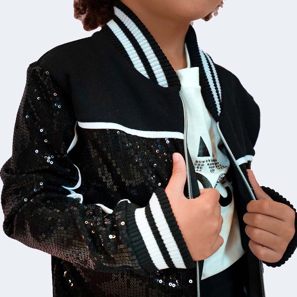 Jaqueta infantil feminina em moletinho preto com detalhes em malha branca, um modelo moderno para o dia a dia e festas! Jaqueta feminina super macia e flexível, além de possuir fecho em zíper, prática e confortável para acompanhar a menina nas brincadeiras. Jaqueta com aplicações de paetê, para a menina arrasar nas sobreposições! Punhos, gola e barra em ribana preta e branca. Peça de metal dourado e strass Pampili na barra.