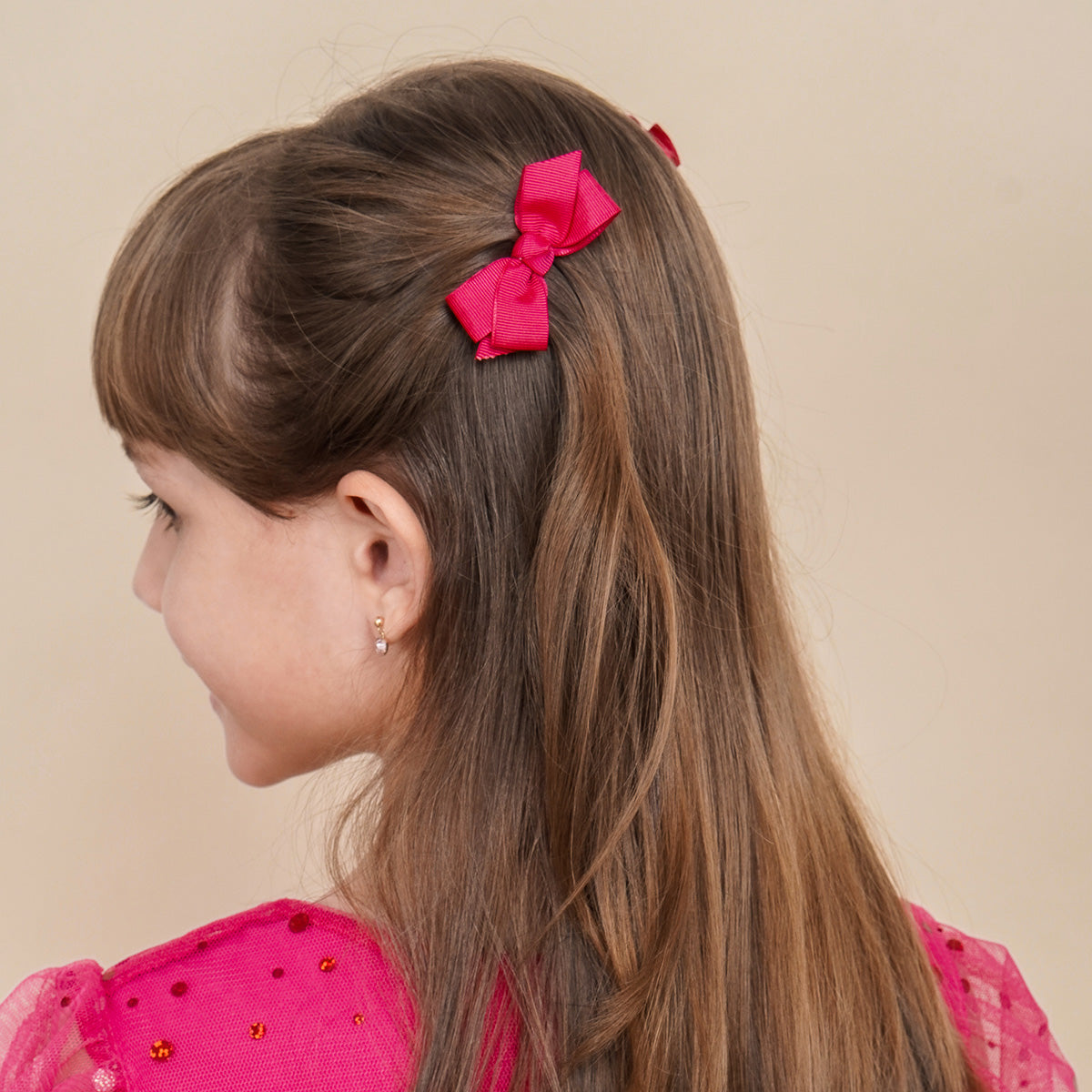 Kit com 2 presilhas de cabelo infantil com laço de fita pink, delicada para os penteados! O par de presilhas conta com bico de pato em metal resistente encapado, que facilita o uso, aumenta o conforto e mantém o acessório bem firme no cabelo.