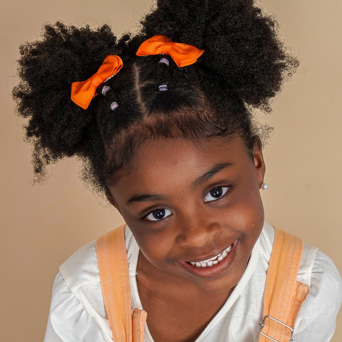 Kit com 2 presilhas de cabelo infantil com laço laranja em tecido, delicada para os penteados! O par de presilhas conta com bico de pato em metal resistente encapado, que facilita o uso, aumenta o conforto e mantém o laço bem firme no cabelo.