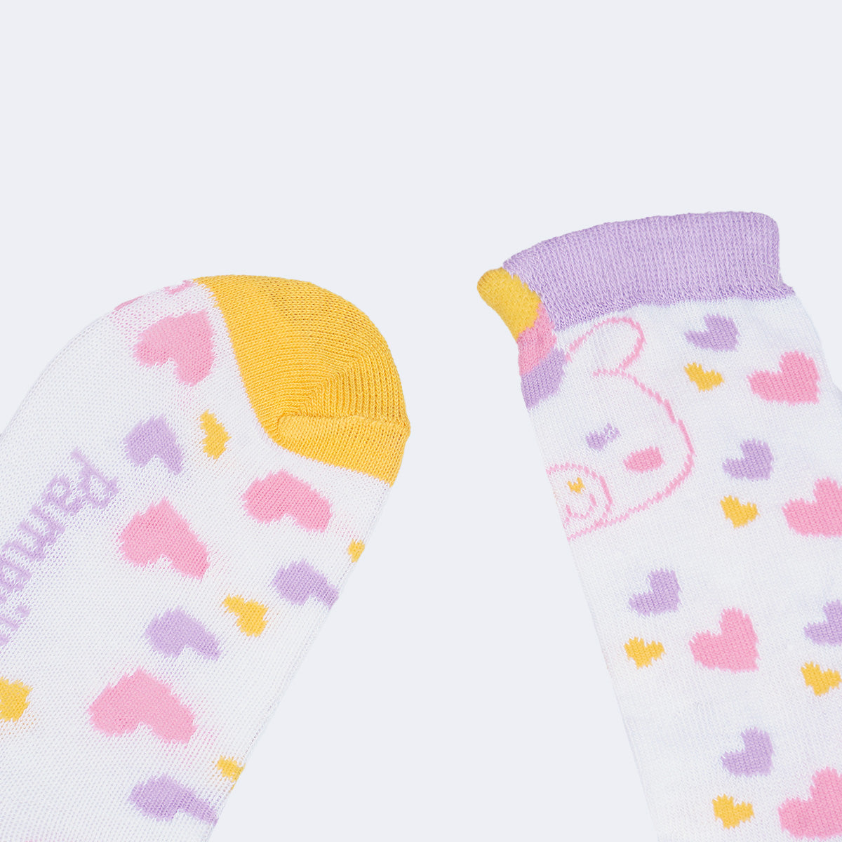 A meia 3/4 infantil é confeccionada em tecido macio cor branca com estampa de mini corações nas cores rosa, lilás e amarelo, garantindo conforto, aquecimento e um visual moderno para usar dentro ou fora de casa.