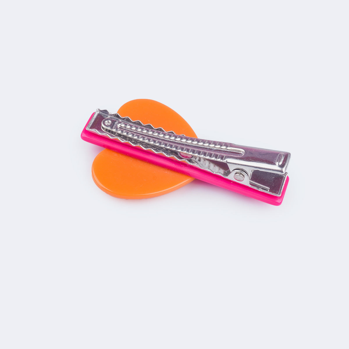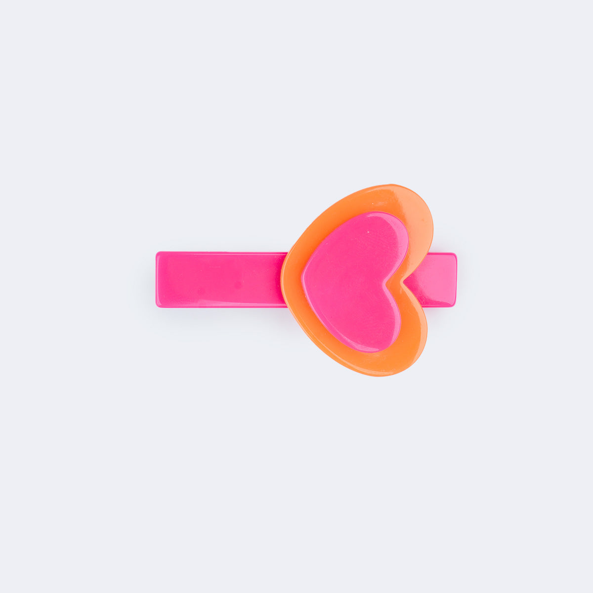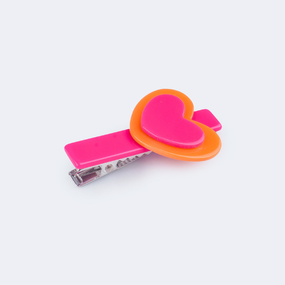 Presilha de cabelo infantil pink e laranja com coração em acrílico, versátil para o dia a dia! Bico de pato em metal prateado, resistente e fácil de colocar!